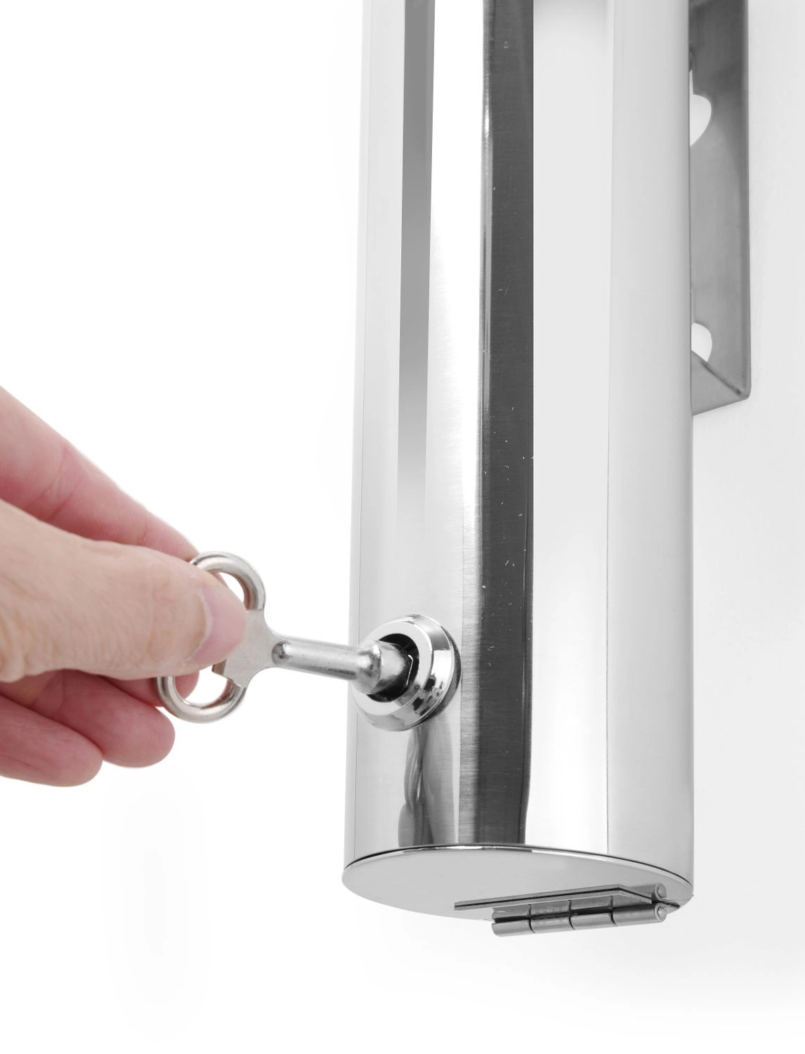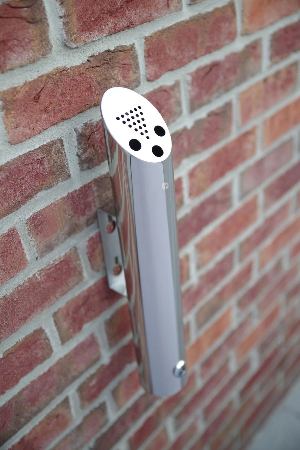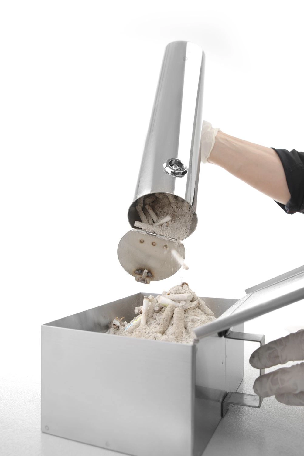 Nástěnný popelník. Robustní konstrukce, snadná instalace na stěny a sloupky. Snadné čištění popelníku otevřením dna, uzamykatelný klíčem.