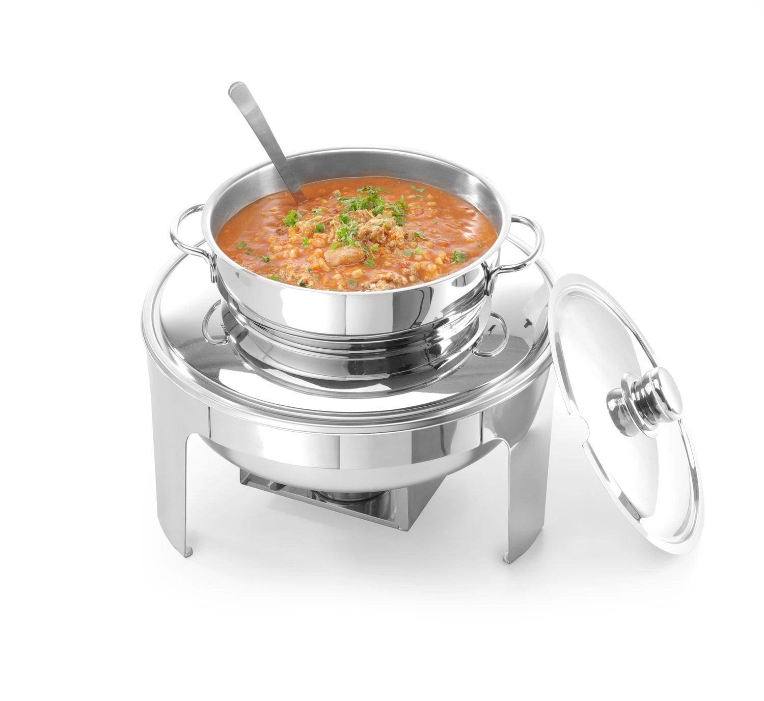 Ohřívač tabulek pro polévky k pastování. Objem 10 l. Vyhřívání palivem. Vyrobeno výhradně z vysoce leštěné nerezové oceli. Vybaveno nádobou na vodu, kulatou nádobou na polévku a nádobou na palivo. Víko nádoby s výřezem pro naběračku.