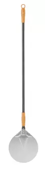 Kulatá loupačka na pizzu o rozměrech 23x120 cm. Vyrobeno z nerezové oceli. Rukojeť s posuvným držadlem usnadňuje vytahování pizzy z trouby.