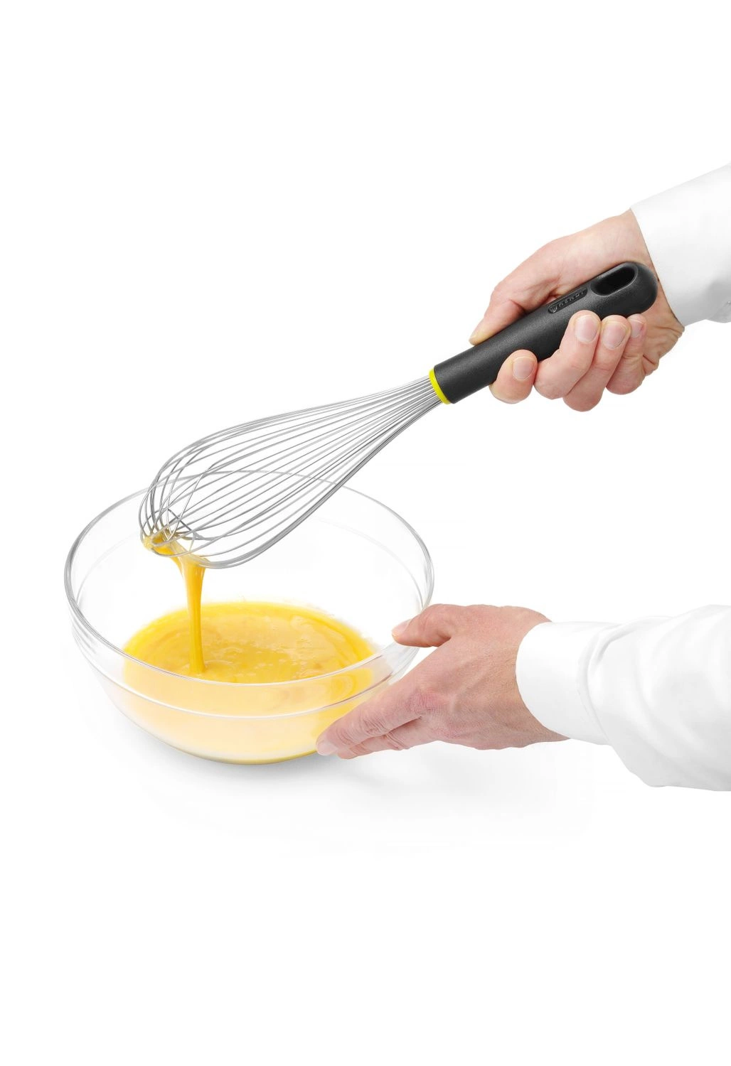Rukojeť z nerezové oceli s polypropylenovou rukojetí. . 35 cm dlouhý. 12 tvrdých vřeten s odpružením. Polypropylenová rukojeť s visačkou na zavěšení. Vhodné pro mytí v myčce.