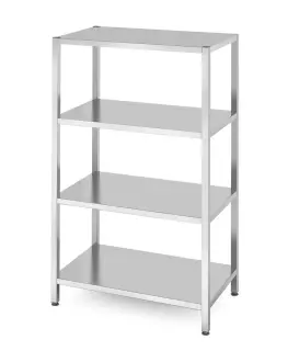 Nerezový čtyřdílný úložný regáls rozměry 100x60x180 cm. Vybaveno 4 zesílenými ocelovými profily s maximální nosností 70 kg/m2. Nohy z profilu 3x3 cm, s nastavitelnými patkami +/-1,5 cm