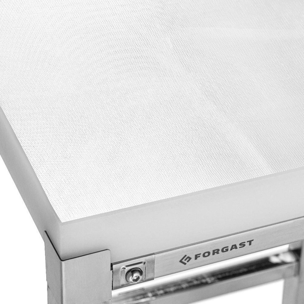 - Odolná polyetylenová deska – pracovní plocha o tloušťce 5 cm zaručuje odolnost vůči intenzivnímu používání, řezání a nárazům, což je obzvláště důležité v masné výrobě a gastronomii.
