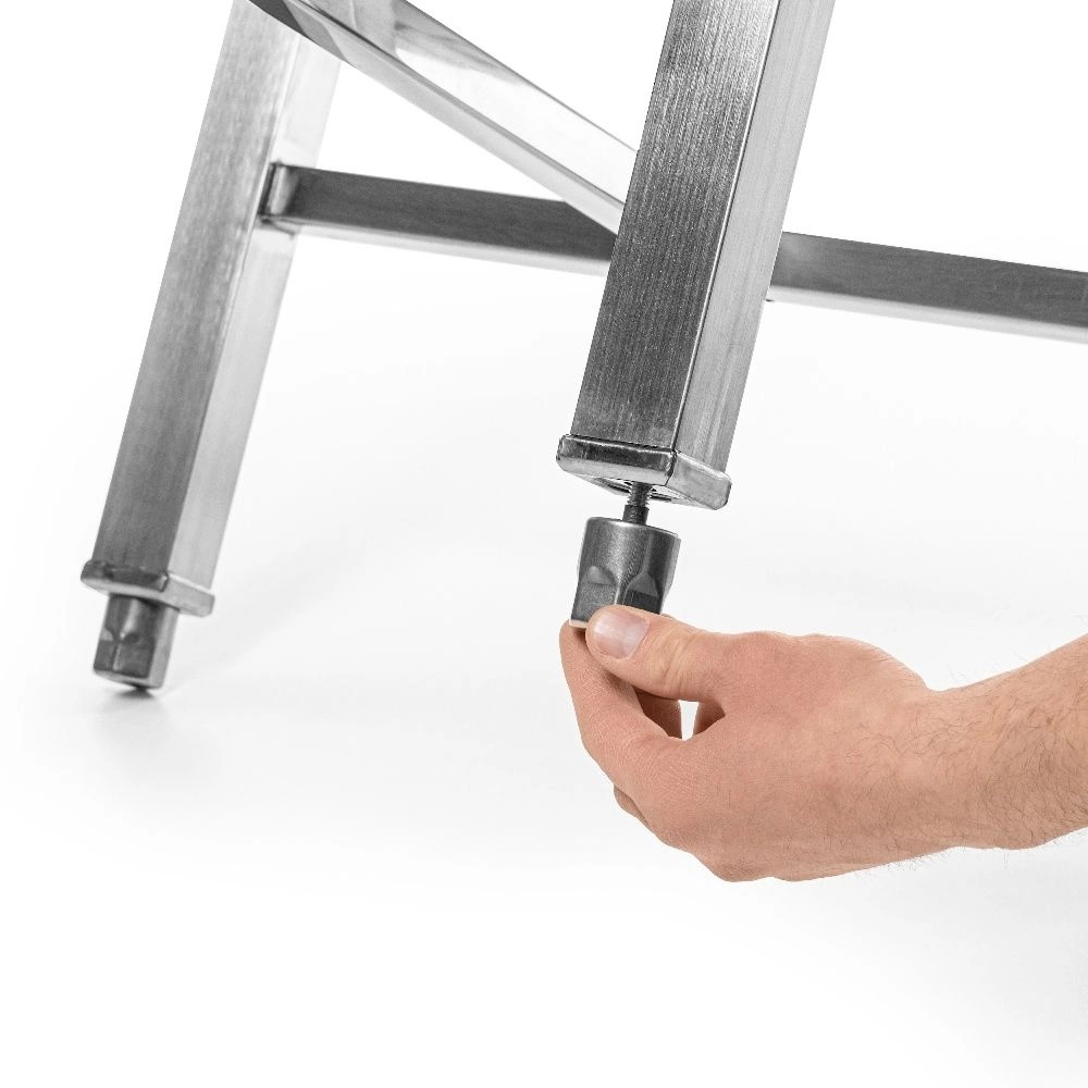 - Stabilní podstavec z nerezové oceli – konstrukce odolná proti korozi zajišťuje bezpečnost používání i ve vlhkém prostředí a snadné čištění, což je nezbytné tam, kde je vyžadována vysoká úroveň hygieny.