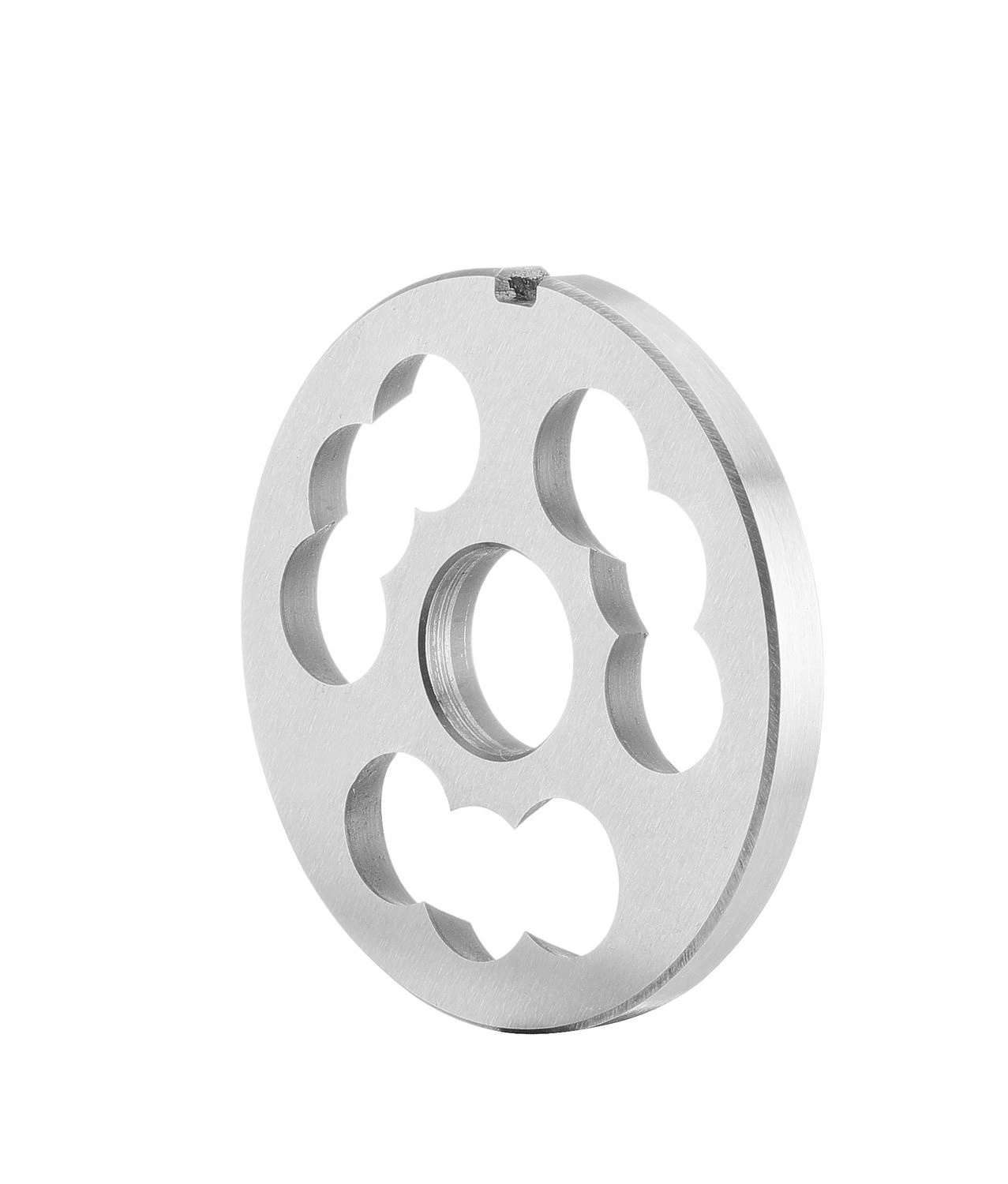 Hrdlo Unger s řezací jednotkou pro pohon PS-22, vyrobené z nerezové oceli. Vybaveno sítkem o průměru ok 6 mm. Celkový průměr síta 8,2 cm.