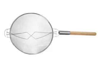 Sito S podóy síťovinou. Dřevěná rukojeť a výztužný držák. Nelze mýt v myčce nádobí.