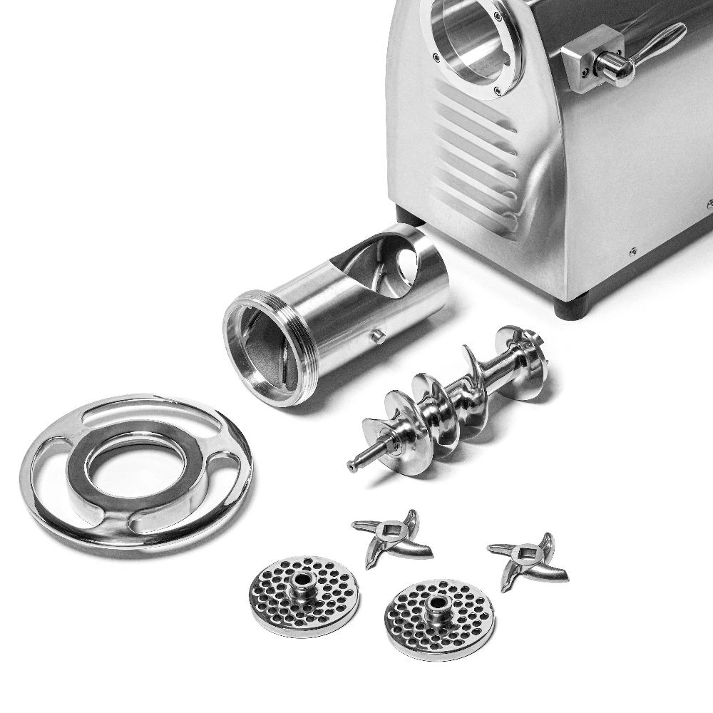 V sadě se strojem jsou dvě sítka s průměrem otvorů 6 a 8 mm, které umožňují přizpůsobit hrubost mletí různým typům produktů. Vnější průměr sítka je 99,5 mm a tloušťka 13 mm, což zajišťuje efektivitu a přesnost práce. Stroj je vybaven kolečkem pro upevnění mlecího nástavce, díky čemuž je montáž a demontáž rychlá a intuitivní – což je zvláště důležité tam, kde záleží na úspoře času a hygieně.