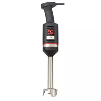 Ruční mixér SAMMIC s mixovacím ramenem. Určeno pro míchání v nádobách do 12 litrůów. Nóy se třemi noži, vyrobenými z tvrzené nerezové oceli, s odolnými břity Záštita nože o průměru od 82 mm. Přídržná plocha je pokryta protiskluzovým materiálem. Počet otáčekós je nastavitelný od 1500 do 15000 ot.