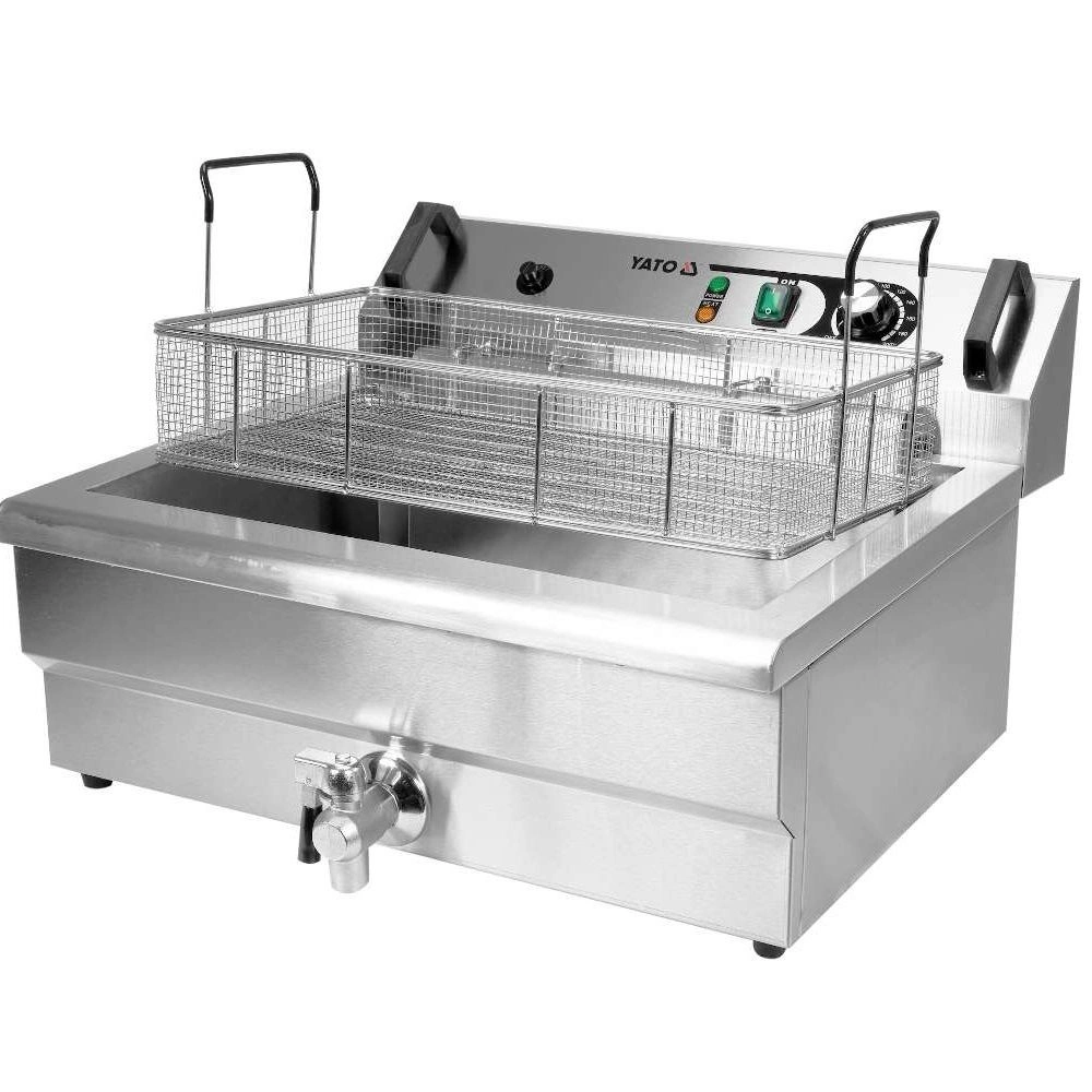Elektrická fritéza YATO YG-04640 - určená pro smažení produktů ve velkém množství tuku, např. masa, ryb, zeleniny, koblih nebo kroket. Celkový objem nádrže fritézy je 30 l – minimální hladina oleje je 17 l a maximální 23 l. Fritéza je vybavena topným tělesem o výkonu 6,0 kW, které je ovládáno pomocí potenciometru umístěného na ovládacím panelu. Pracovní teplota 60oC - 200oC. Díky stříkavě odolnému vypínači lze zařízení vypnout bez nutnosti odpojování napájecího kabelu ze sítě.