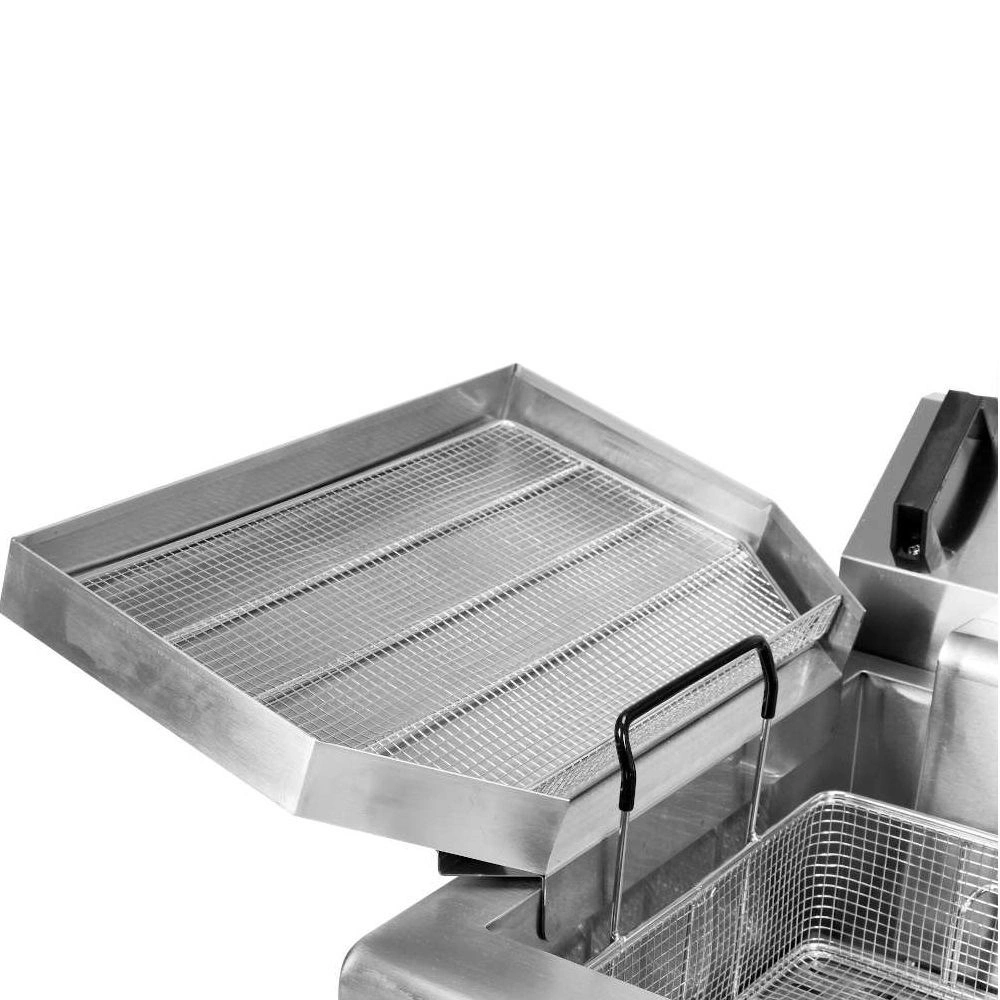 Zařízení je vybaveno také košem o rozměrech 27x48x9 cm s bočními úchyty a speciálními háčky, které umožňují zavěšení koše přímo nad nádrž, a bočním odkapávačem, na který lze odložit smažené produkty k vychladnutí.