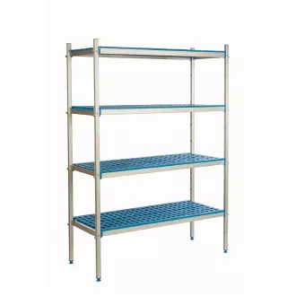 Volně stojící police z hliníku a polypropylenu s 5 polióoblouky od společnosti Alushelf o rozměrech 536x40x175 cm. Má extrémně lehkou konstrukci, takže se snadno přemisťuje a přestavuje. Stojan lze sestavit bez použití nářadí. Kostra je vyrobena z vysoce kvalitních eloxovaných hliníkových profilů pro vysokou odolnost proti korozi. Police jsou vyrobeny z polypropylenu v modré barvě. Každá police unese zatížení přibližně 100 kg na běžný metr police (při rovnoměrném rozložení zboží). Regály je možné nastavit každých 15 cm. Nožičky jsou určeny pro přímý styk s potravinami, což potvrzuje certifikát PZH. Rozsah nastavení nožiček až 18 mm umožňuje vyrovnat regál i na šikmém povrchu.
