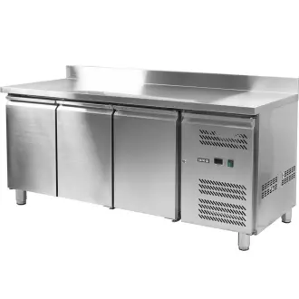 Chladicí stůl 3-dveřový s lemem značky YATO  o rozměrech pracovní desky 179,5x70x95 cm a objemu 417 l. Navržený pro skladování potravin v teplotním rozsahu od -2°C do +80°C. Vnější a vnitřní plášť je vyroben z vysoce kvalitní nerezové oceli SS201, což zajišťuje elegantní vzhled a zároveň velmi snadnou údržbu čistoty. Pracovní deska má zadní lem o výšce 10 cm. Stůl je vybaven 4 nohami s nastavitelnou výškou v rozmezí 12~18 cm. Stůl je vybaven třemi výklopnými, samouzavíracími dveřmi s ergonomickými madly a každé dveře mají v sadě jednu roštovou polici potaženou PVC s maximální nosností 40 kg při rovnoměrném zatížení. Tento model umožňuje také skladování GN 1/1 nádob.