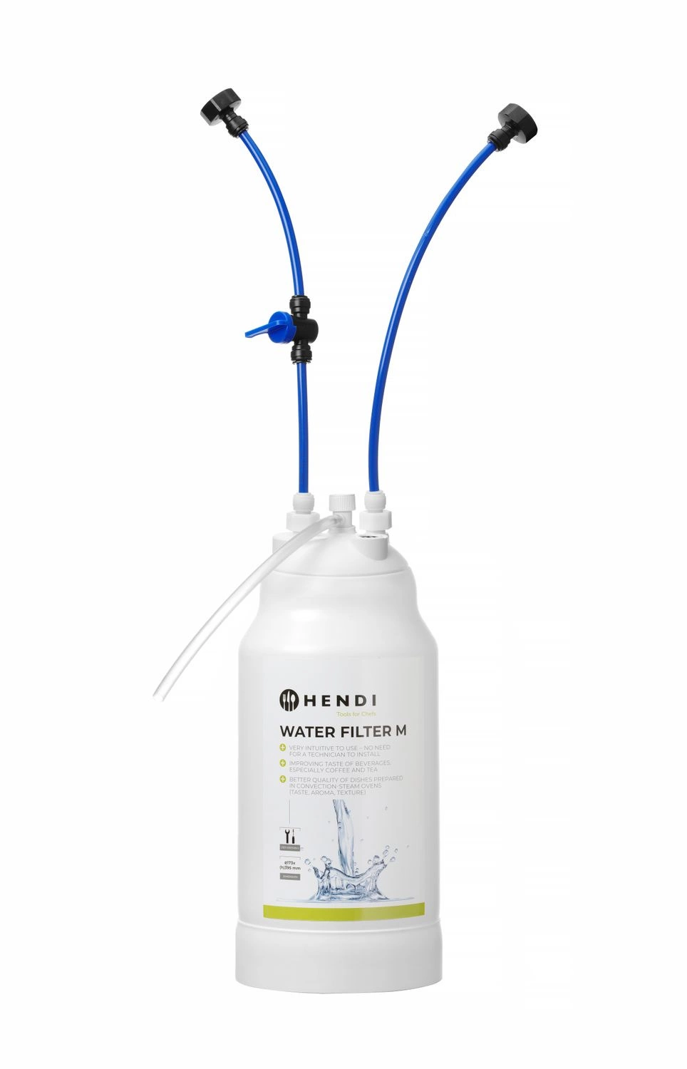 Vodní filtr značky HENDI M;je spolehlivým řešením pro profesionální gastronomické provozy, ideální pro použití s konvektomaty, kávovary, automaty na kostky, prodejními automaty a myčkami nádobí. Díky pokročilé technologii úpravy vody zajišťuje filtr HENDI vynikající kvalitu vody tím, že odstraňuje nežádoucí pachy a chutě, snižuje obsah chlóru, snižuje tvrdost a působí jako bakteriostat.
