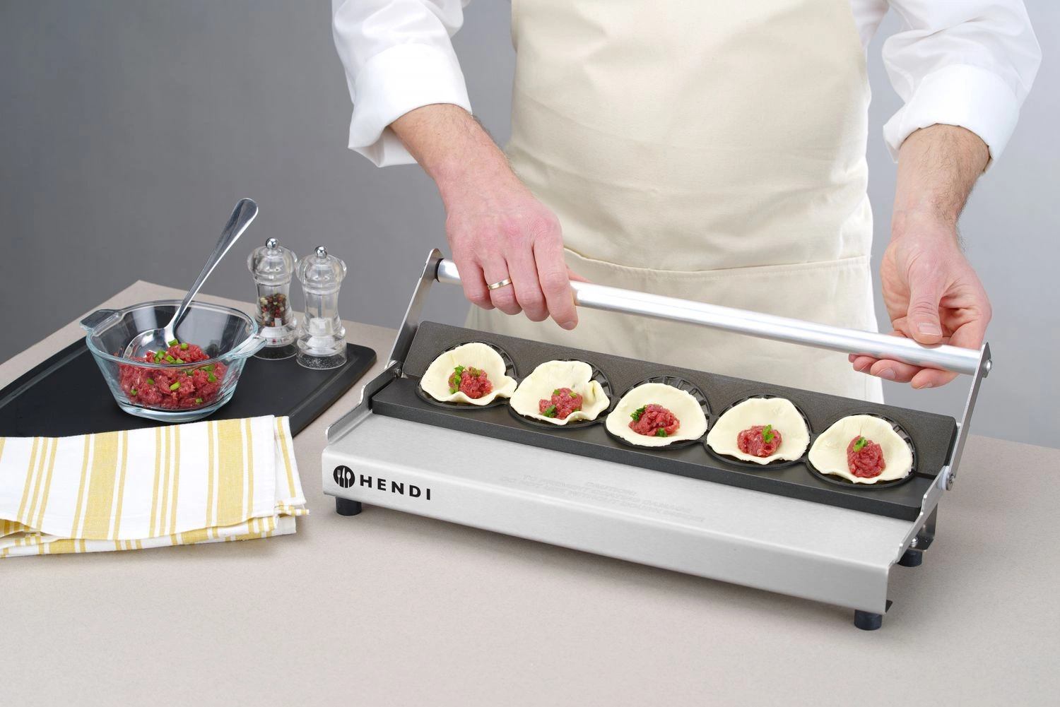 Ruční stroj na knedlíky od společnosti Hendi, Navrženo pro snadnou přípravu až 5 knedlíků najednou. Kryt knedlíků je vyroben z nerezové oceli s kartáčovanou povrchovou úpravou. Lisovací rukojeť je umístěna po celé délce formy, což zajišťuje rovnoměrné lisování a přesné slepení knedlíků. Rukojeť je vyrobena z hliníku. Závěsy spojující základnu s pohyblivou částí jsou vyrobeny z nerezové oceli. Teflonová vložka mezi oběma částmi zajišťuje hladký chod bez tření. Pracovní plocha byla opatřena nepřilnavým povrchem, který výrazně usnadňuje odstraňování přilepených knedlíkóů. Na spodní straně jsou umístěny 4 protiskluzové nóy, které zajišťují, aby přístroj při práci neklouzal.