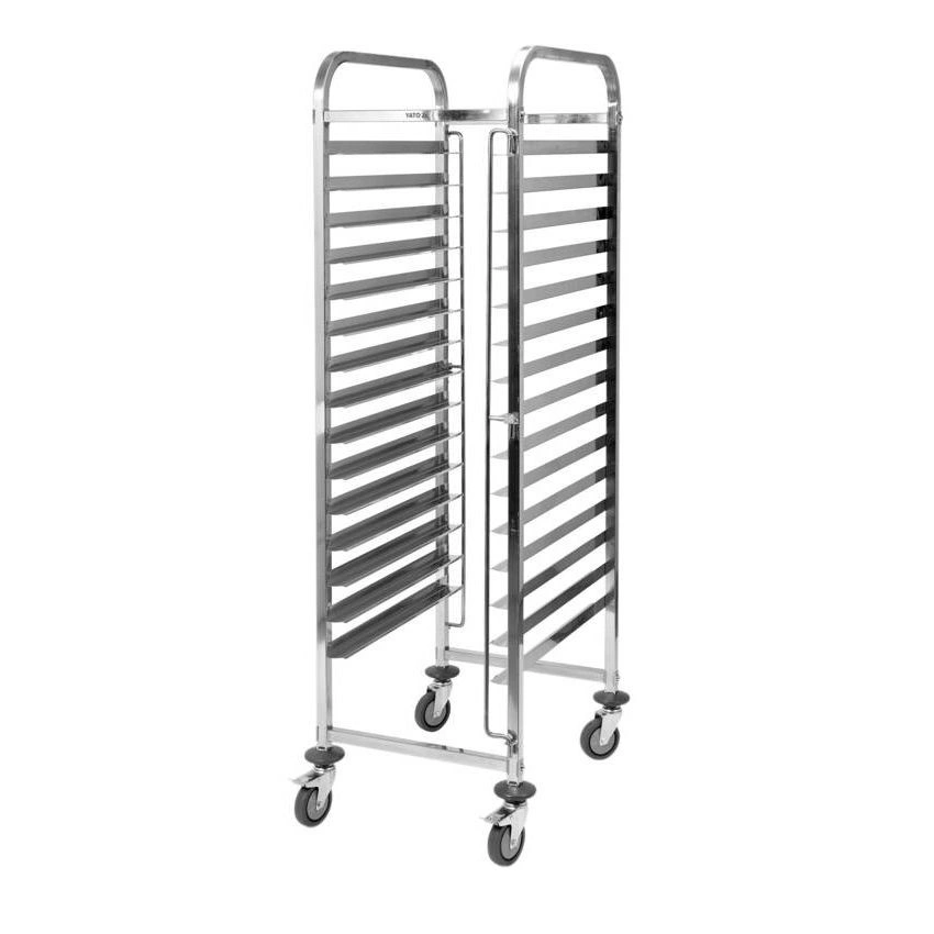 Wózek Skládací přepravní jednotka značky YATO o rozměrech 47x62x170 cm. Pojme 15 pečicích plechů o rozměrech 60x40 cm nebo 15 číšnických plechů o rozměrech 60x40 cm. Konstrukce wózek je vyrobena z profilů o tloušťce 0,9 mm, vyrobených z vysoce kvalitní nerezové oceli typu 201. . Díky tomu poskytuje wózek YATO nejen odolnost proti korozi, ale také snadnou údržbu. Jeho robustní konstrukce zajišťuje výjimečnou stabilitu, přičemž každý z pózek je navržen tak, aby snadno vydržel zatížení až 40 kg. Díky tomu je wózek nepostradatelný v rušném gastronomickém prostředí.
