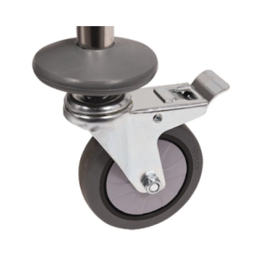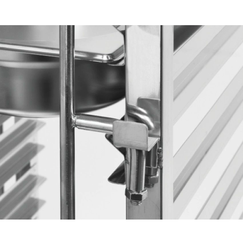 Speciálně navržená vodítka ve tvaru písmene L, rozmístěná po 80 mm, zajišťují stabilní umístění zásobníků a táců a zároveň nabízejí velkou plochu pro přepravované produktyós. Vozík je vybaven 4 ložiskovými vačkami z vysoce kvalitního šedého TPR. Díky použití tohoto tvrdého a zároveň pružného materiálu mají kolečka velmi tichý chod a nepoškrábou podlahu. Jsou také otočná o 360°, což umožňuje snadné manévrování i v těžko přístupných místnostech a úzkých chodbách. Kromě toho jsou 2 z cókolíček vybavena brzdami, což zvyšuje kontrolu nad wókolíčky při nakládání a vykládání. Bezpečnost přepravy je zajištěna speciálními zámky na obou stranách wózky.
