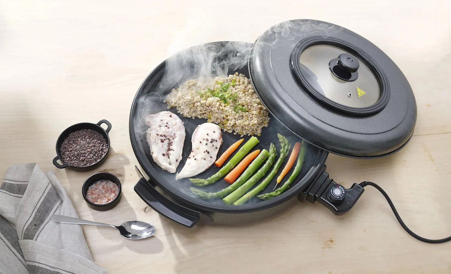 Elektrický multipanel o průměru 40 cm s víkem. Víko s průhledným sklem. Pánev vyrobená z hliníku, vnitřek potažený teflonem. Odnímatelný termostat s napájením.