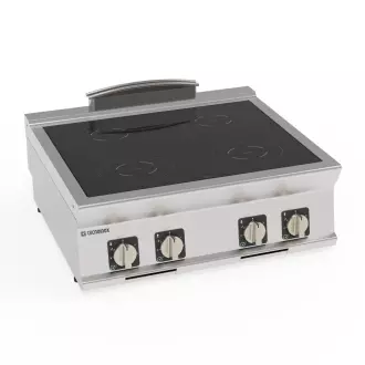 Tecnoinox 4-zónový nastavitelný indukční vařič 14 kW od Tecnoinox Řada Tecno74 je kombinací modernosti a spolehlivosti a je určena pro střední a velké restaurace a hotely. Byla vytvořena s ohledem na nejvyšší standardy kvality a nabízí nejen výjimečný výkon, ale dbá i na detaily, které usnadňují každodenní práci v kuchyni. Vyrobeno z nerezové oceli nejvyšší třídy AISI 304 Tloušťka 1,5 mm zaručuje odolnost a snadné čištění díky lisovaným vrchním částem se zaoblenými rohy.