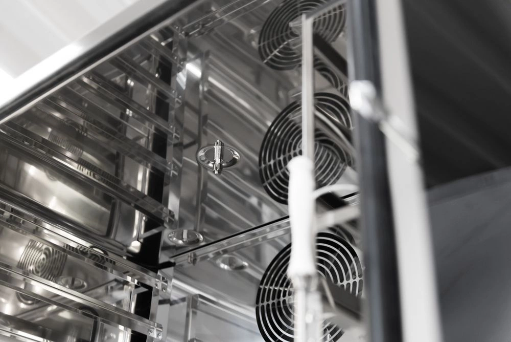 Komora trouby je vyrobena z kyselinovzdorné nerezové oceli AISI 304. Zaoblené rohy komory usnadňují čištění trouby. Vnitřní prostor je vybaven výsuvy pro 10 plechů GN 1/1 nebo 10 plechů 60x40 cm. Vzdálenost mezi vodítky je 80 mm, což zajišťuje lepší cirkulaci vzduchu mezi plechy. V komoře je instalováno halogenové osvětlení a 3 ventilátory s možností reverzace. Dvířka trouby mají dvojitéóy sklo a otevírají se doleva. Plášť je vyroben z nerezové oceli AISI 430.