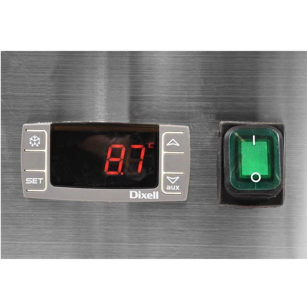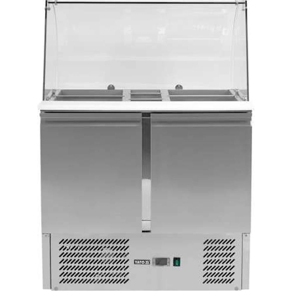 Dvoudveřová chladnička na salát se skleněným nástavcem z tvrzeného skla o objemu 240 litrů a rozměrech 90x70x85 cm od společnosti YATO. Je určena pro skladování potravin v teplotním rozmezí +2 °C až +8 °C. Vnější a vnitřní plášť z vysoce kvalitní nerezové oceli 201 zaručuje elegantní vzhled a zároveň se velmi snadno čistí. Horní část je navíc opatřena výklopným vókrytem z nerezové oceli. Stó³³ je vybavena výklopnými, samouzavíracími dvířky s ergonomickými úchyty a ke každým dvířkům je dodávána jedna roštová podložka potažená PVC (32,5x56 cm) s maximální nosností 40 kg při rovnoměrném zatížení. Tento model umožňuje také skladování kontejnerů GN 1/1ós.