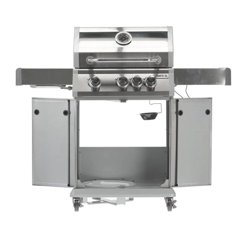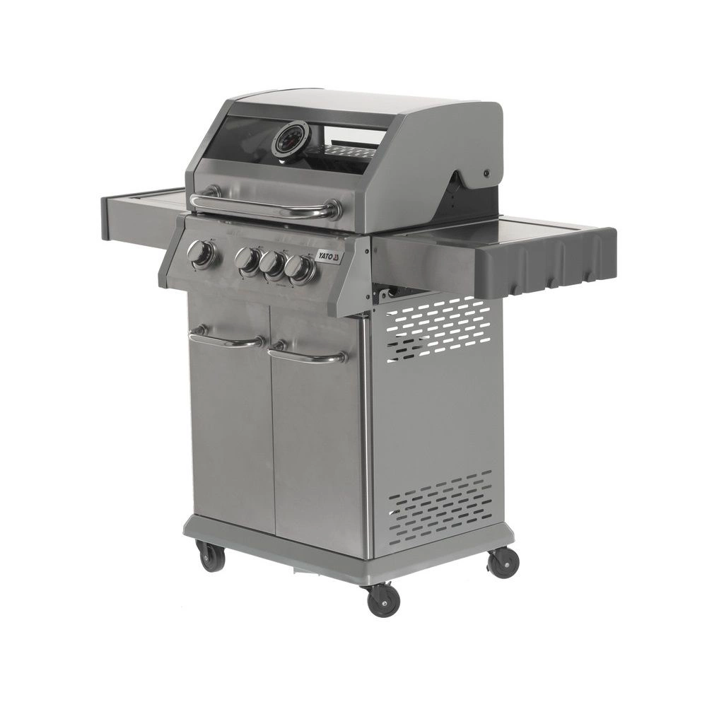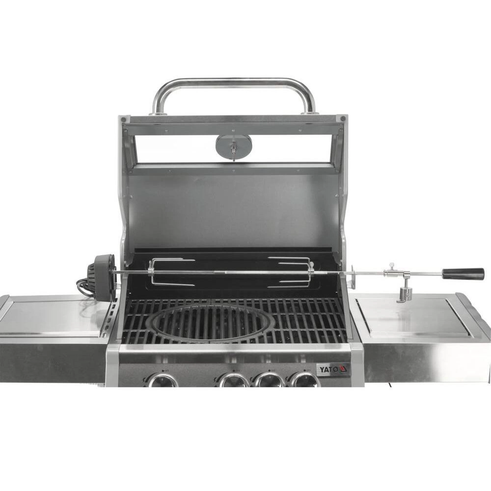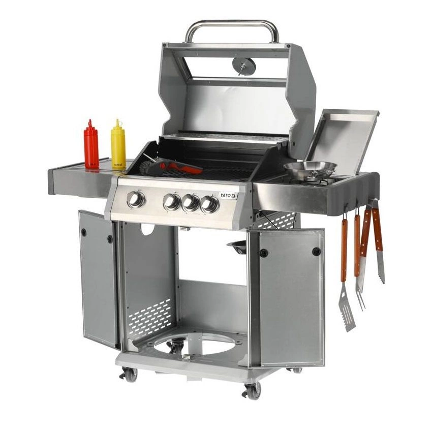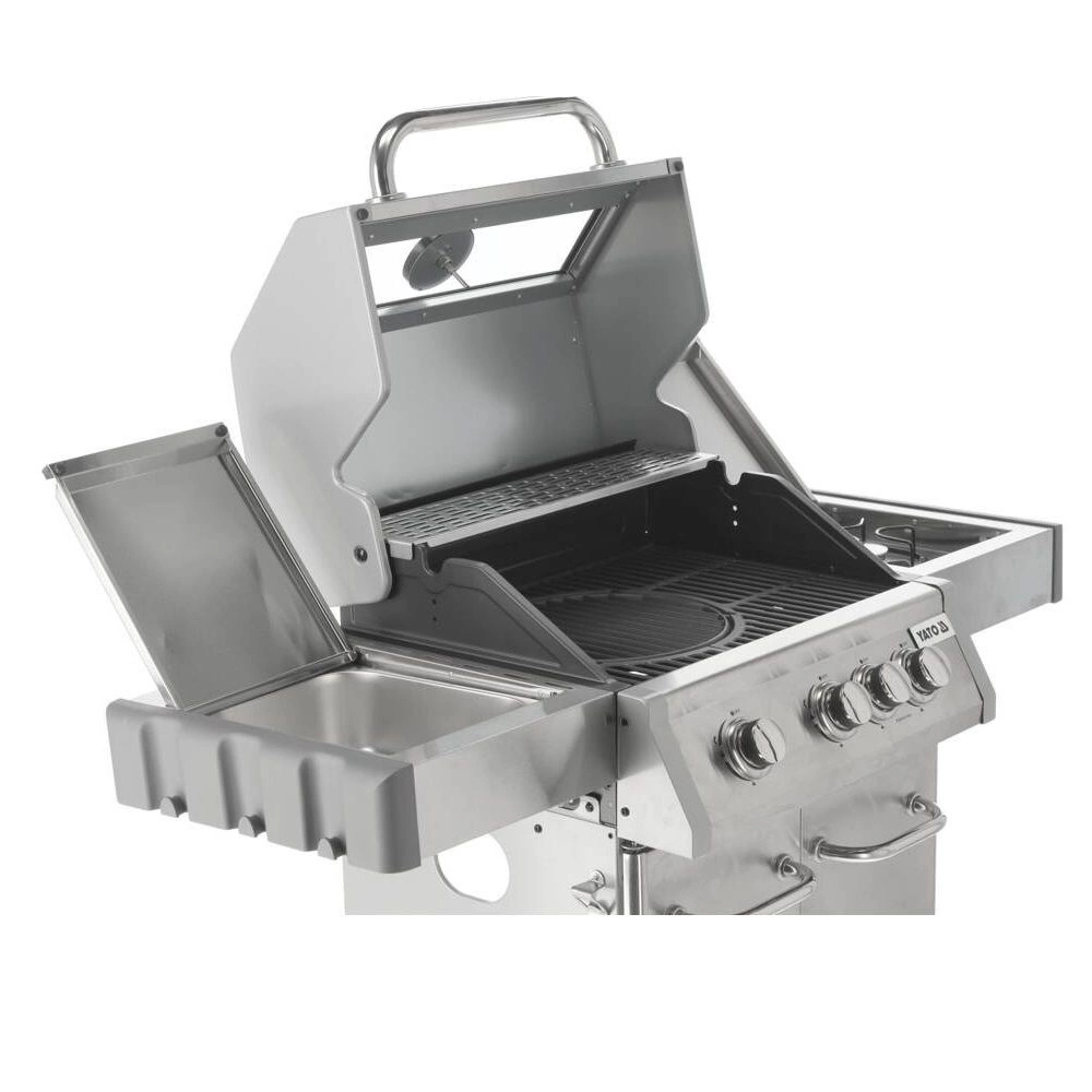 Plynový gril 3+1 značky YATO o rozměrech 122x57x114 cm vyrobený z vysoce kvalitní nerezové oceli 403. Centrálním prvkem grilu je rychle se zahřívající žebrovaný litinový rošt o rozměrech 60x41,5 cm, který dlouho udržuje teplo. Navíc má gril vyjímatelný kulatý rošt o průměru 30 cm, zabudovaný v hlavním roštu. Tento prvek lze snadno nahradit pizzovým kamenem (není součástí balení), což rozšiřuje možnosti grilu. Pohodlí při používání zajišťují také boční police a prostorná uzavíratelná skříňka, které usnadňují skladování potřebného příslušenství, koření a dalšího vybavení. Rozměr boční police: 34,5x42,5 cm. Přídavný boční hořák o výkonu 2,2 kW otevírá nové možnosti, umožňuje vaření a ohřívání jídel v hrnci nebo na pánvi. Výhodou je místo pro polskou plynovou láhev 11 l, nerezová nádoba umístěná v jedné z bočních polic a zabudovaný otvírák na lahve.