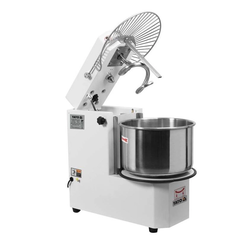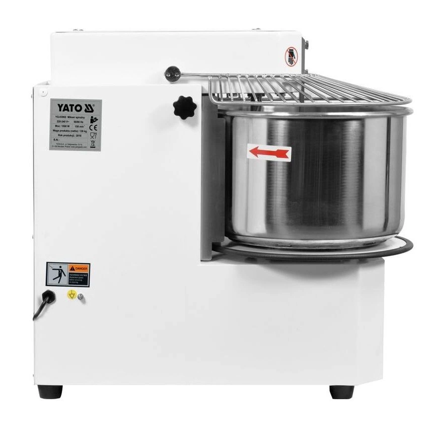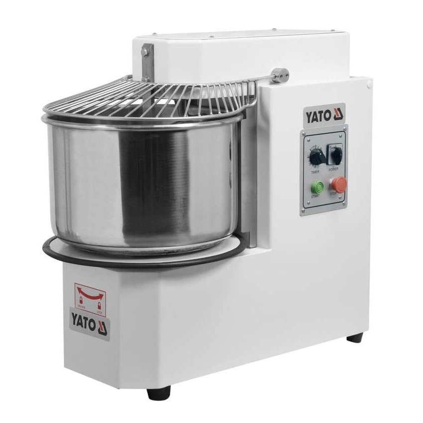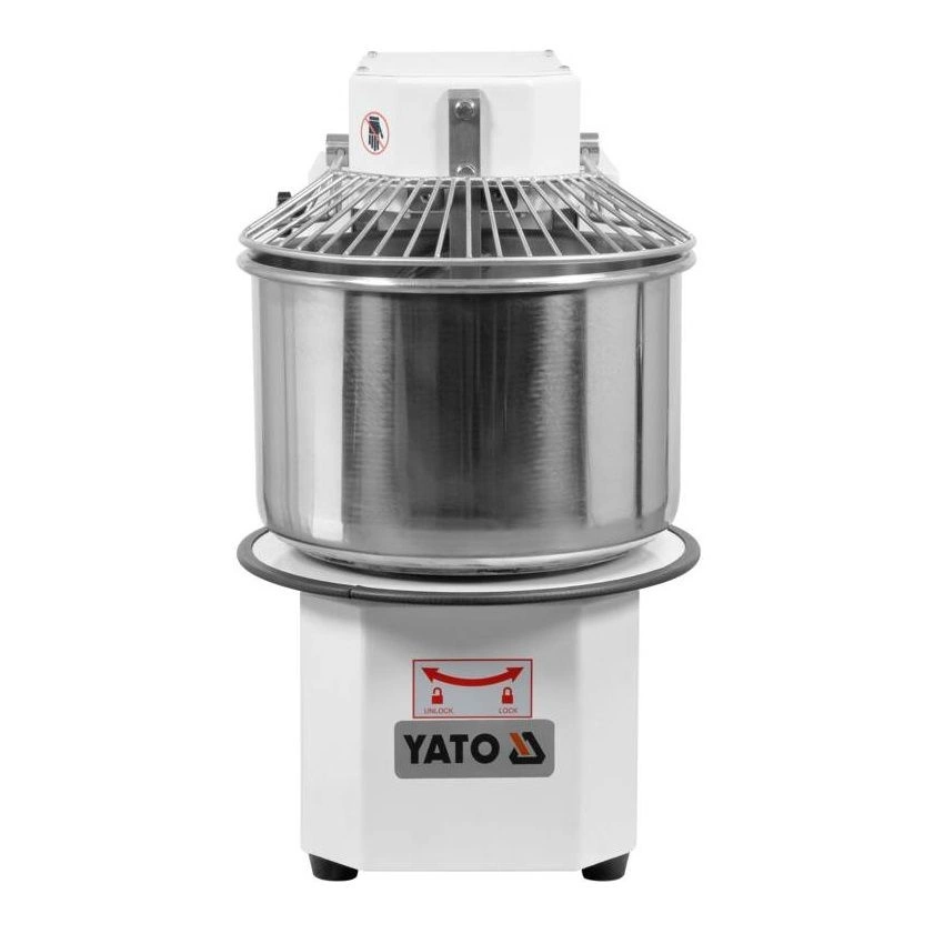 Spirálový mixér YATO s odnímatelnou mísou o objemu 30 litrů a průměru 41 cm s naklápěcí hlavou. Spotřebič je ideální pro hnětení těžkých těst, jako je pizza, chléb, knedlíky, koblihy. Tento mixér je navržen s ohledem na funkčnost a bezpečnost a splní potřeby profesionálních kuchařů. Mixér je vyroben z hliníku a oceli a lakován v bílé barvě, takže nejenže vypadá esteticky, ale také se snadno udržuje v čistotě. Mísa a další příslušenství z nerezové oceli jsou bezpečné pro styk s potravinami. Maximální zatížení těsta je 12 kg. Vestavěný časovač umožňuje nastavit dobu provozu až na 60 minut. Přepnutí do manuální polohy umožňuje nepřetržitý provoz. Rozměry přístroje jsou 76x80x44 cm.