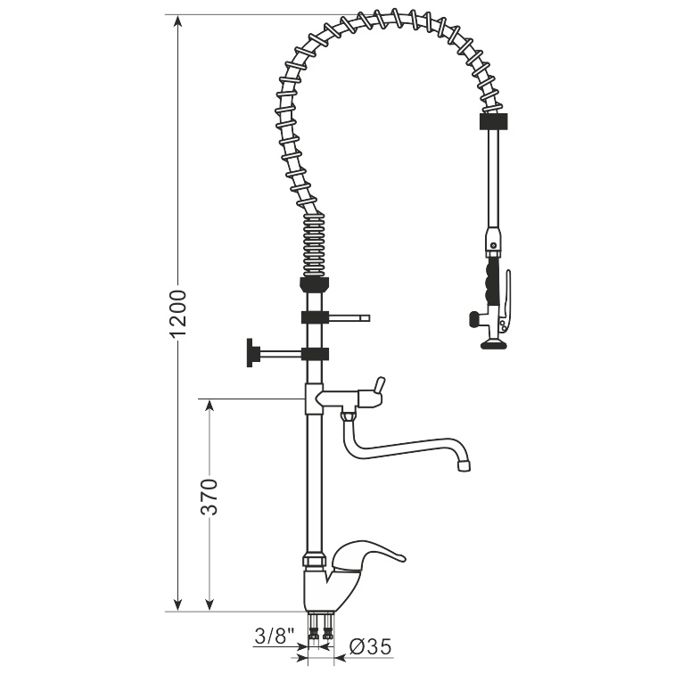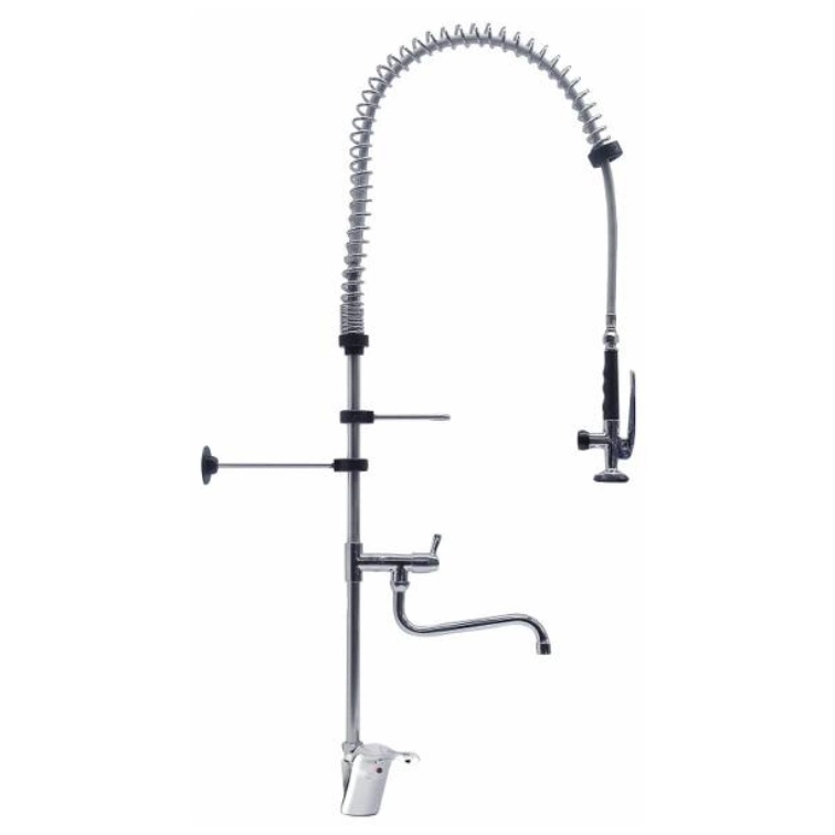 Stojánková baterie s podložkou a výlevkou AG-1M/05FE. Keramické hlavice. Izolovaná zesílená hadice na koncích. Chromovaný ocelový knoflík a páka. Chromovaná ocelová pružina. Otočná výtoková trubice.