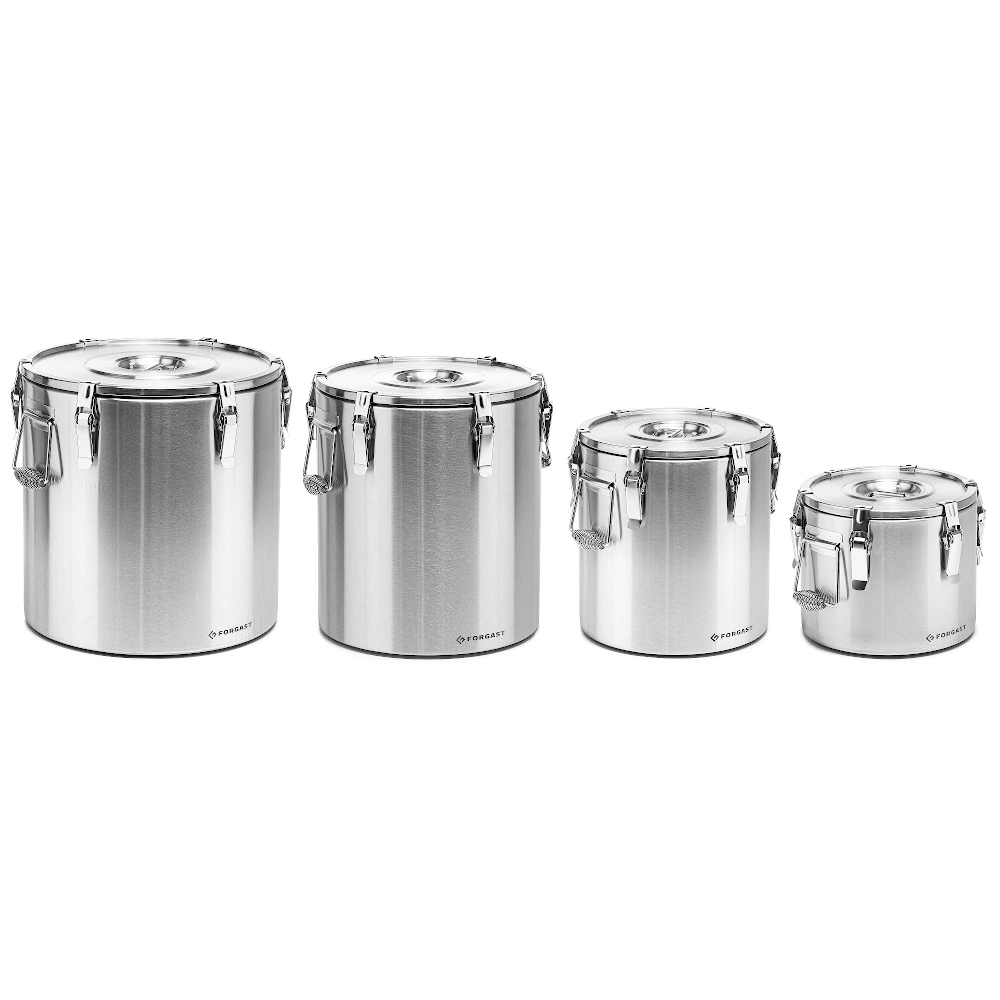 Nerezový termos FORGAST FG05323 byl navržen s ohledem na intenzivní používání v gastronomii. Vnitřek i plášť jsou zcela nerezové, což přispívá k dlouhé životnosti výrobku a hygieně používání. Ergonomická držadla usnadňují přenášení i při plném naplnění. Termos není určen pro stohování – doporučuje se jeho samostatné umístění. Sada obsahuje tělo termosu a těsné víko se západkami a silikonovým těsněním.