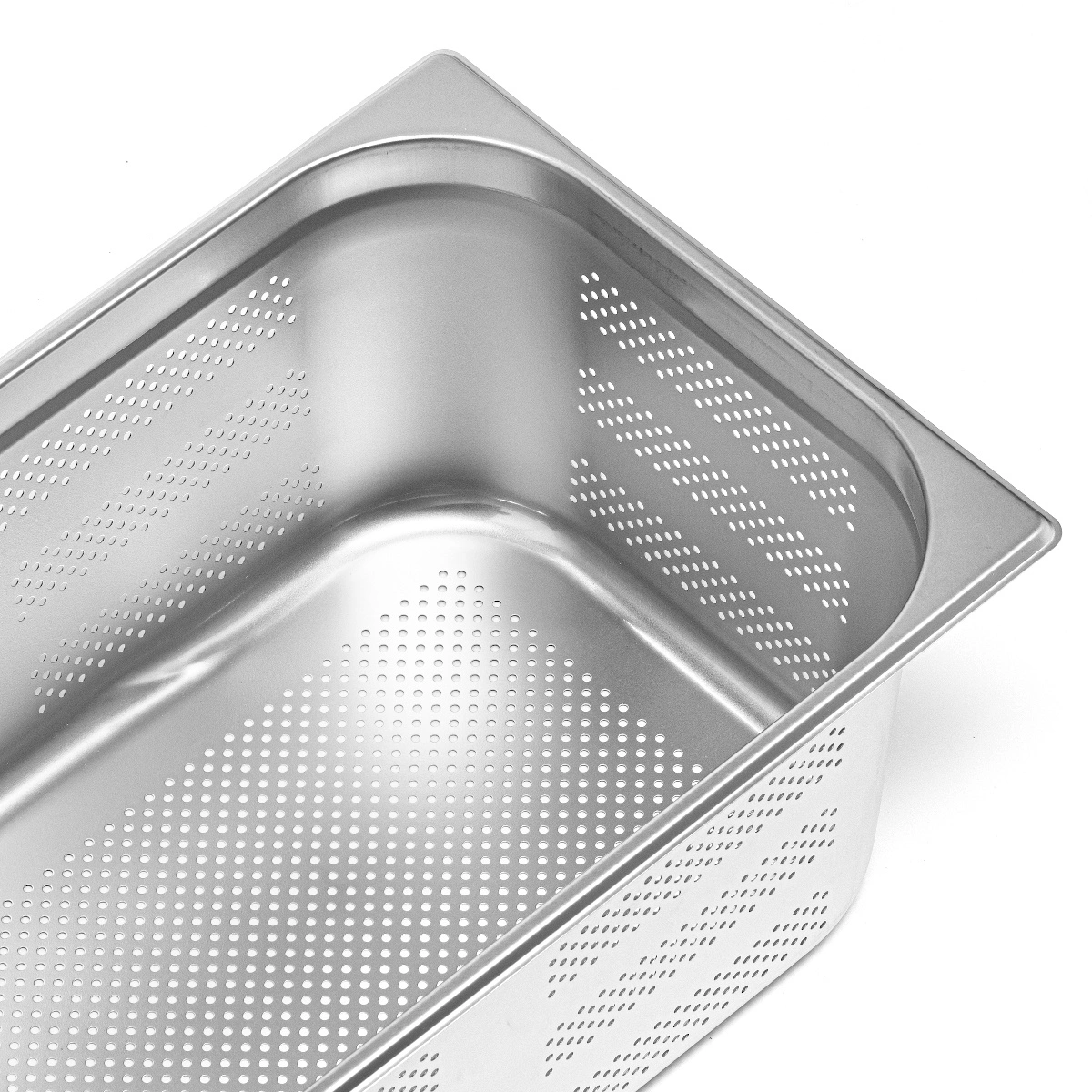 Nádoba je vyrobena z vysoce kvalitní nerezové oceli o tloušťce 0,7 mm, což jí zajišťuje odolnost a odolnost proti poškození. Perforace jsou rovnoměrně rozmístěny po celé ploše dna i stěn, což podporuje účinné odvádění tekutin. Zaoblené rohy nejen usnadňují čištění, ale také zvyšují bezpečnost používání tím, že eliminují ostré hrany. Součástí balení je jedna nádoba GN 1/1 o hloubce 20 cm.