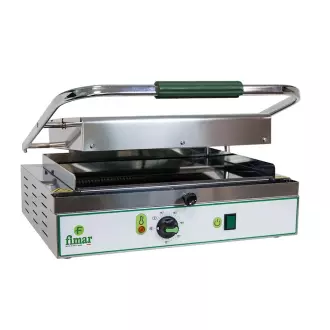 Profesionální kontaktní gril panini s keramickými deskami značky Fimar je zařízení určené pro rychlé a efektivní grilování různých potravin. Díky kombinaci hladké a rýhované desky a inovativní topné technologii je ideální volbou pro gastronomii, bary, bistra a food trucky. Zařízení umožňuje přípravu šťavnatých mas, křupavých sendvičů, zeleniny, sýrů nebo toastů, přičemž zachovává jejich přirozenou chuť a strukturu.