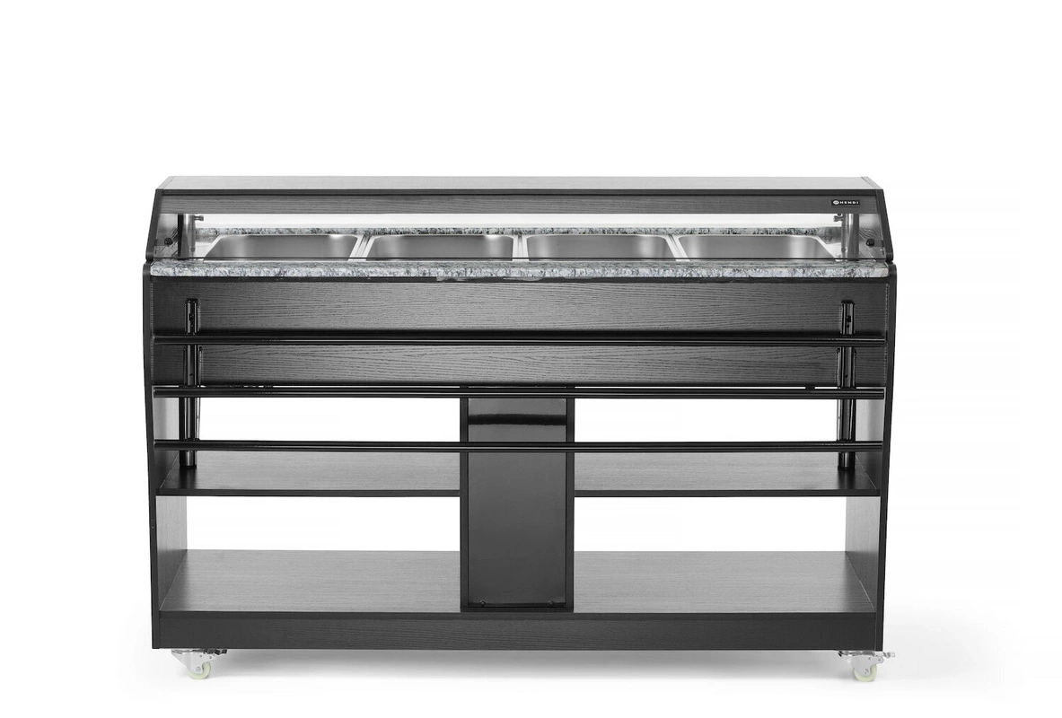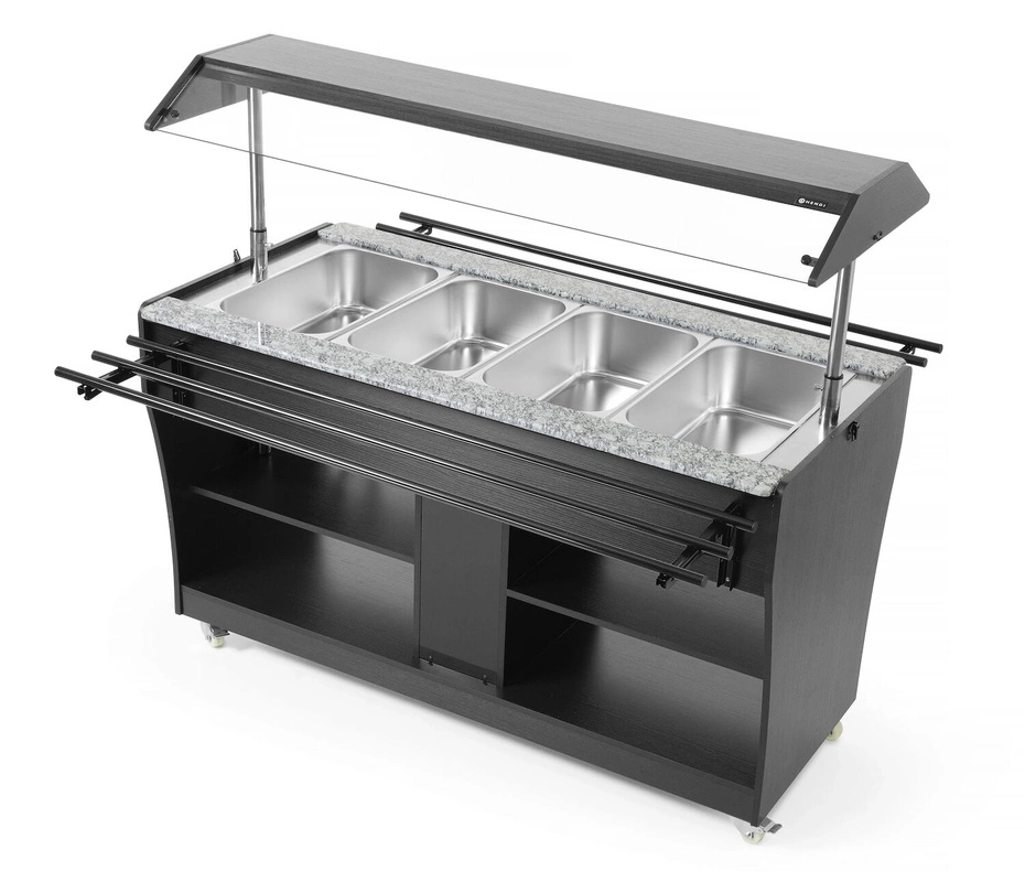 Vitrína HENDI, ohřívací bufet je elegantní a funkční řešení pro samoobslužné restaurace a stravovací zařízení. Díky stylovému designu, který kombinuje nerezovou ocel s černou dřevěnou překližkou, vypadá vozík nejen esteticky, ale je také velmi praktický.