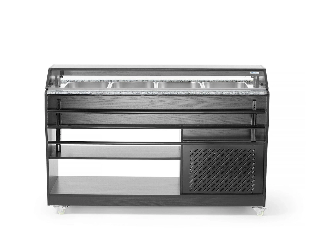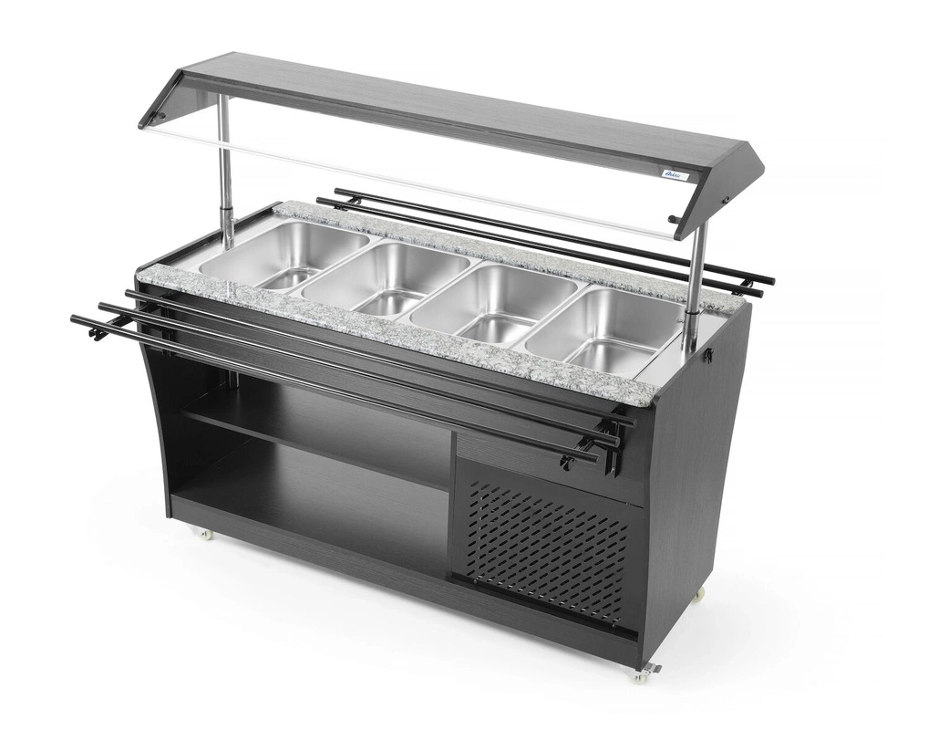 Chlazený bufet HENDI Arktic je elegantní a funkční řešení pro skladování a podávání studených potravin v samoobslužných restauracích a stravovacích zařízeních. Díky stylovému designu, který kombinuje nerezovou ocel s černou dřevěnou překližkou, je vozík nejen praktický, ale také estetický.