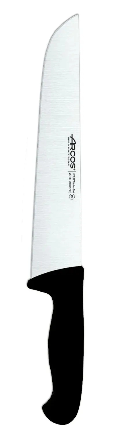 Řeznický nůž řady 2900 od společnosti Arcos je profesionální nástroj určený k přesnému čtvrcení a krájení velkých kusů masa. Nůž je vyroben ve Španělsku a vyznačuje se pevnou a stabilní čepelí z válcovaného plechu z inovativní nerezové oceli NITRUM®, která zaručuje zvýšenou tvrdost a odolnost proti korozi. Díky své výjimečné odolnosti a výkonu je ideální volbou pro kuchaře a řezníky. Rukojeť nože je ergonomicky tvarovaná, vyrobená z polypropylenu, který je vstřikován přímo do střenky, což dále zpevňuje konstrukci nože. Drsný strukturovaný povrch rukojeti s protiskluzovou technologií zabraňuje vyklouznutí nože z ruky a zajišťuje bezpečné uchopení i v náročných pracovních podmínkách. Povlak BACTIPROOF SILVER® minimalizuje hromadění bakterií, což zvyšuje úroveň hygieny při práci.