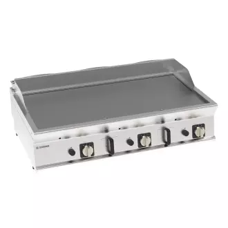 Grilovací deska je vybavena 3 dvouramennými hořáky z chromované oceli o výkonu 7 kW, z nichž každý má nezávislé varné zóny. Zařízení má termostatický regulační ventil s rozsahem teplot od 150 °C do 300 °C, který zajišťuje přesné vaření. Bezpečnost provozu je zaručena pilotním hořákem, bezpečnostním termočlánkem a piezoelektrickým zapalováním s ochranným uzávěrem proti vodě.