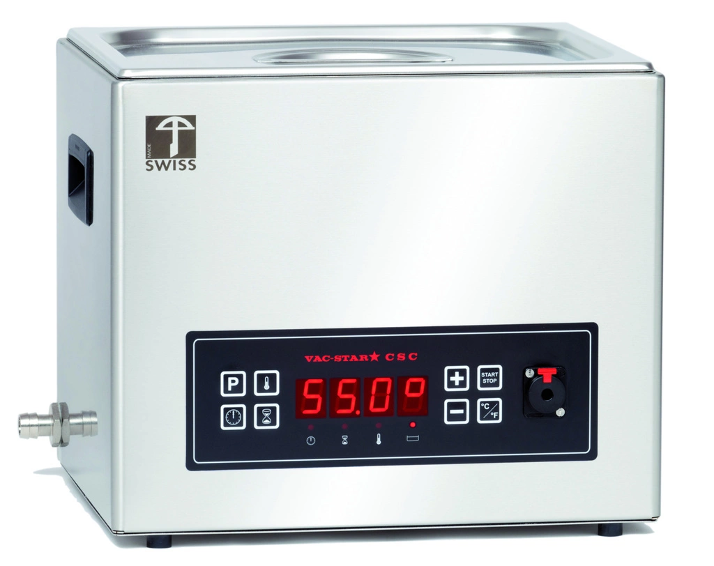 CSC-09 CT je profesionální a moderní přístroj švýcarské společnosti Vac-Star, určené k vaření ve vakuu metodou sous vide. Přístroj je vyroben výhradně z vysoce kvalitní nerezové oceli a poskytuje přesnou regulaci teploty díky digitálnímu ovládání a PID regulátoru teploty, který zaručuje přesnost teploty s přesností na 0,2 °C. Přístroj má objem 9 litrů, takže je ideální pro profesionální použití v restauracích, hotelech a stravovacích zařízeních. Model s označením CT má navíc integrovanou sondu pro měření vnitřní teploty.