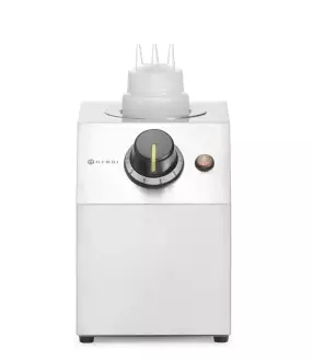 Ohřívač omáček HENDI je profesionální nástroj, který je ideální do každé kuchyně, zejména při servírování dezertů. Je navržen tak, aby udržoval omáčky teplé, umožňuje přesné dávkování a udržuje stejnoměrnou konzistenci. Díky nastavitelné teplotě od 30 do 65 °C umožňuje upravit hustotu omáčky podle individuálních potřeb. Plášť ohřívače je vyroben z odolné nerezové oceli, která zaručuje dlouhodobé používání. Spotřebič je vybaven šestistupňovým knoflíkem pro regulaci teploty a světelnou kontrolkou, která signalizuje průběh ohřevu. Dodává se s LDPE lahví o objemu 650 ml, která je dokonale sladěna s ohřívačem.