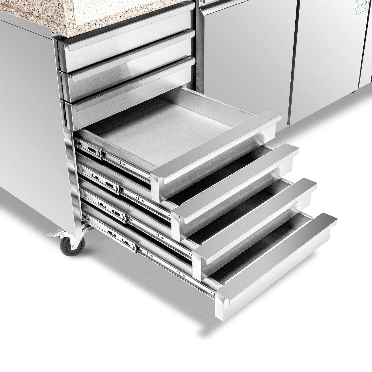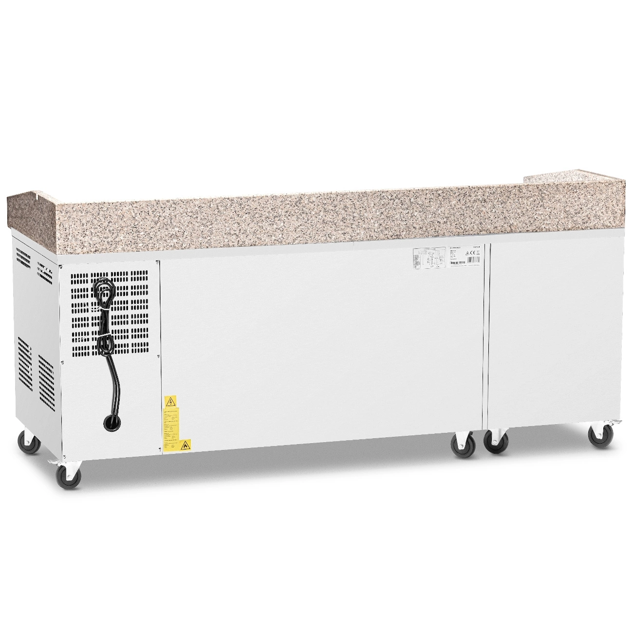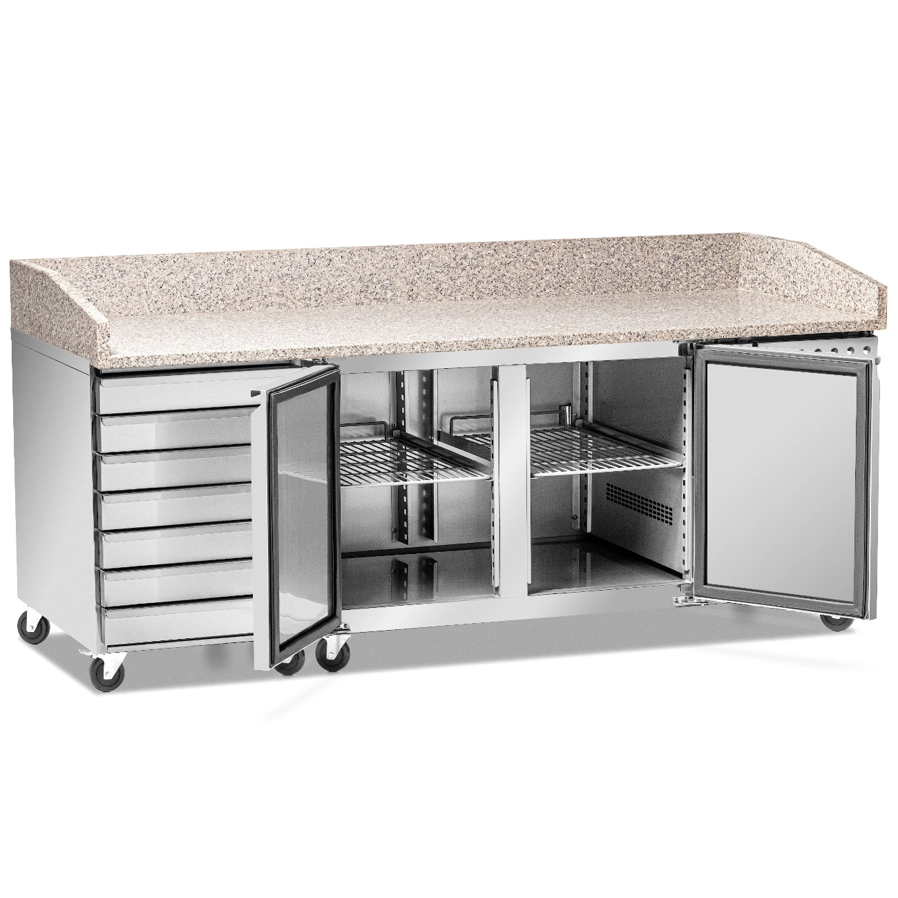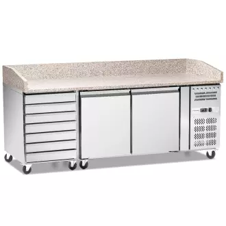 • Sedm praktických zásuvek a dvě prostorné police – umožňují pohodlné třídění a rychlý přístup k produktům, což výrazně zefektivňuje práci kuchařů při přípravě pizzy nebo salátů.