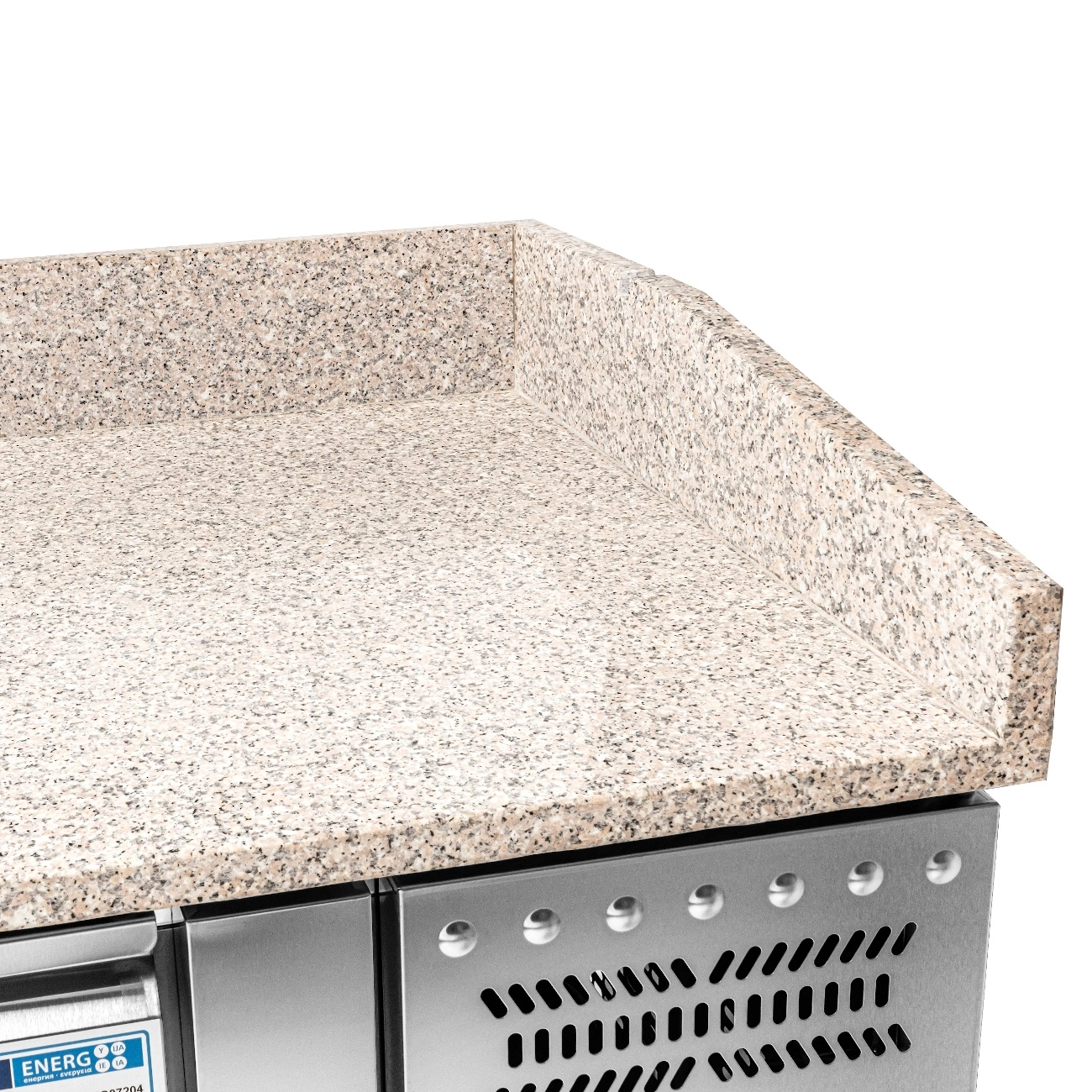 Chladicí stůl na pizzu 2-dveřový se zásuvkami 428 l FORGAST FG07204 je profesionální zařízení určené pro gastronomii, které spojuje funkci skladování a přípravy surovin. Vyznačuje se prostornou chladicí komorou a pevným pracovním povrchem z žuly, což jej činí nepostradatelným v pizzeriích, restauracích a dalších provozovnách, kde jsou vyžadovány čerstvé ingredience a rychlý přístup k produktům.