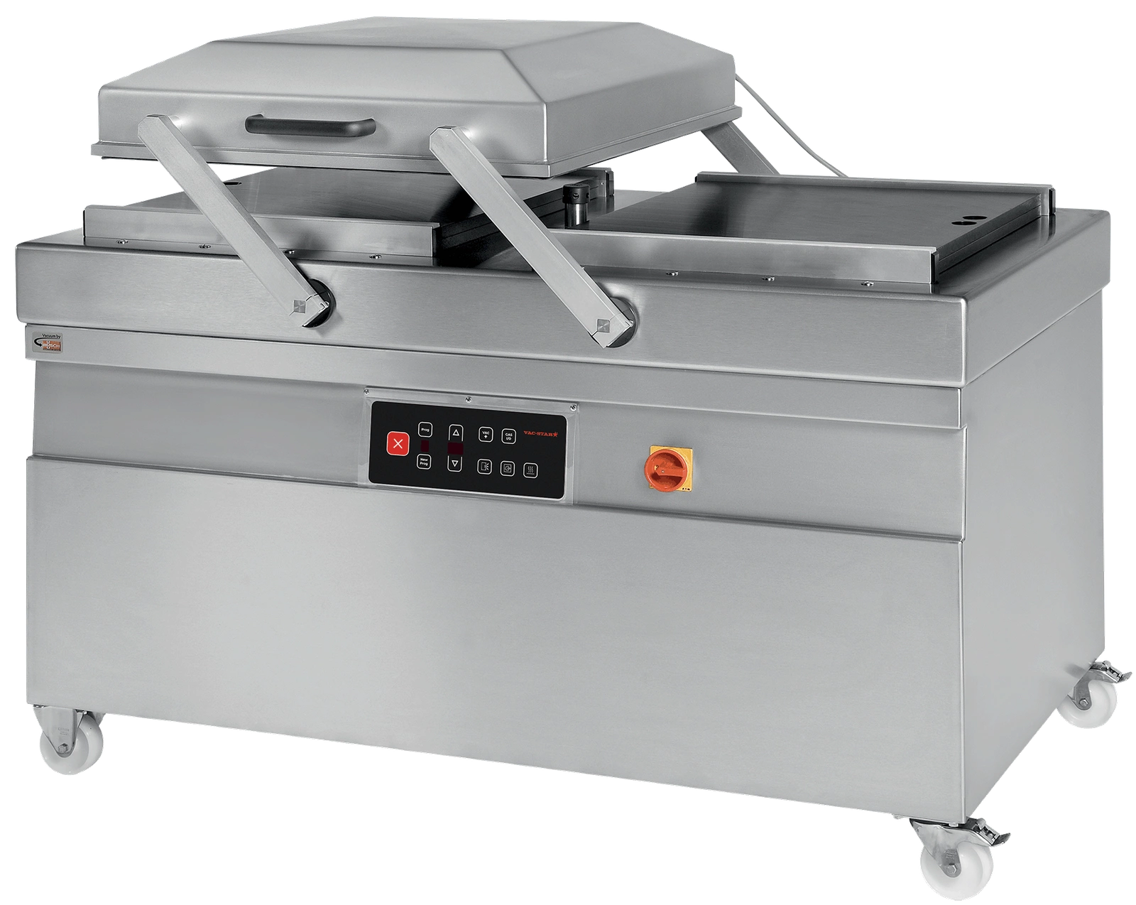 Zvýšený výkon vakuové pumpy až 160 m³/h umožňuje ještě rychlejší a efektivnější balení velkého množství výrobků. Dvě prostorné komory a čtyři těsnicí tyče umožňují balit více výrobků současně, což výrazně zvyšuje produktivitu.