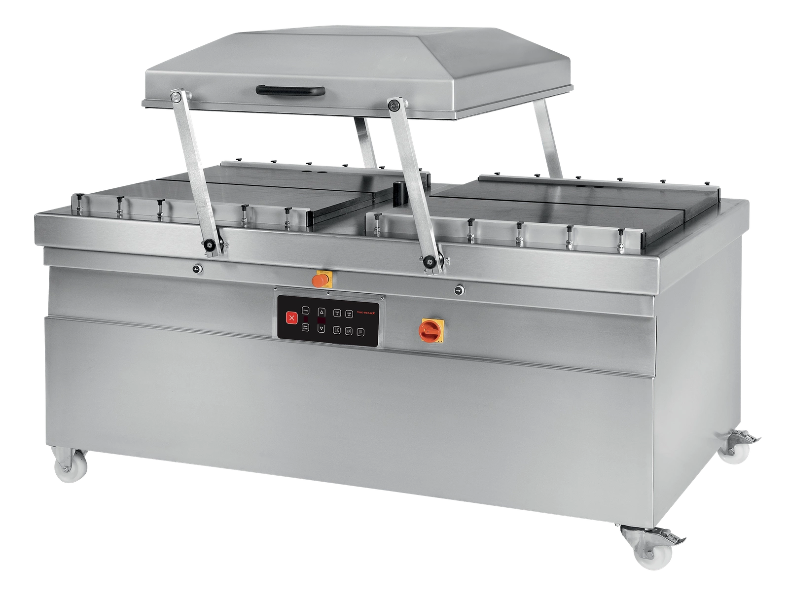 Mobilní vakuový balicí stroj INV 30/30 - FB B250 od společnosti VAC-STAR je moderní dvoukomorový stroj určený pro intenzivní použití v potravinářském průmyslu a velkých stravovacích zařízeních. Tento model se vyznačuje robustní konstrukcí, vysokým výkonem a technologiemi, které zajišťují přesné a rychlé vakuové balení.