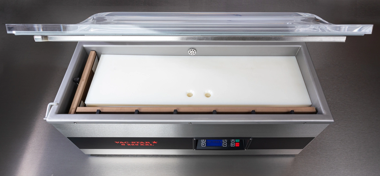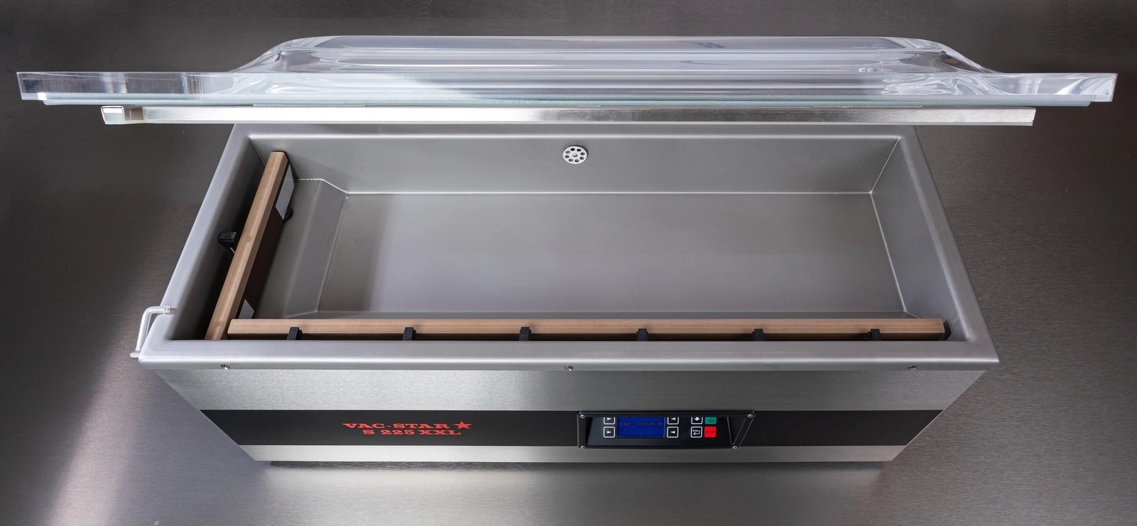 Model S 225-XXL SX je vybaven prostornou komorou o rozměrech 950 × 330 × 160 mm, která umožňuje balit výrobky o maximální velikosti sáčku 280 × 950 mm. Průhledné víko z PMMA (plexiskla) podepřené plynovými pružinami zajišťuje plný přehled o procesu balení. Dvě těsnicí tyče o délce 280 mm (vlevo) a 890 mm (vpředu) umožňují pohodlně a pevně uzavřít i extrémně dlouhé výrobky. Standardní výbava zahrnuje 3 bílé polyethylenové vložky a speciální vložku na kapaliny, díky čemuž je stroj mimořádně všestranný.