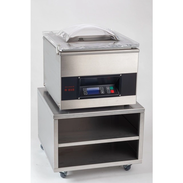 Základna je celá vyrobena z vysoce kvalitní nerezové oceli (CNS), která je odolná proti korozi a snadno se udržuje. Konstrukce je vybavena čtyřmi otočnými kolečky, z nichž dvě jsou opatřena brzdami, což umožňuje snadné přemisťování a stabilitu pěchovače během provozu. Díky ergonomické výšce a praktickému úložnému prostoru získá uživatel pohodlný přístup ke stroji a prostor pro uložení příslušenství, jako jsou vakuové sáčky nebo nářadí.