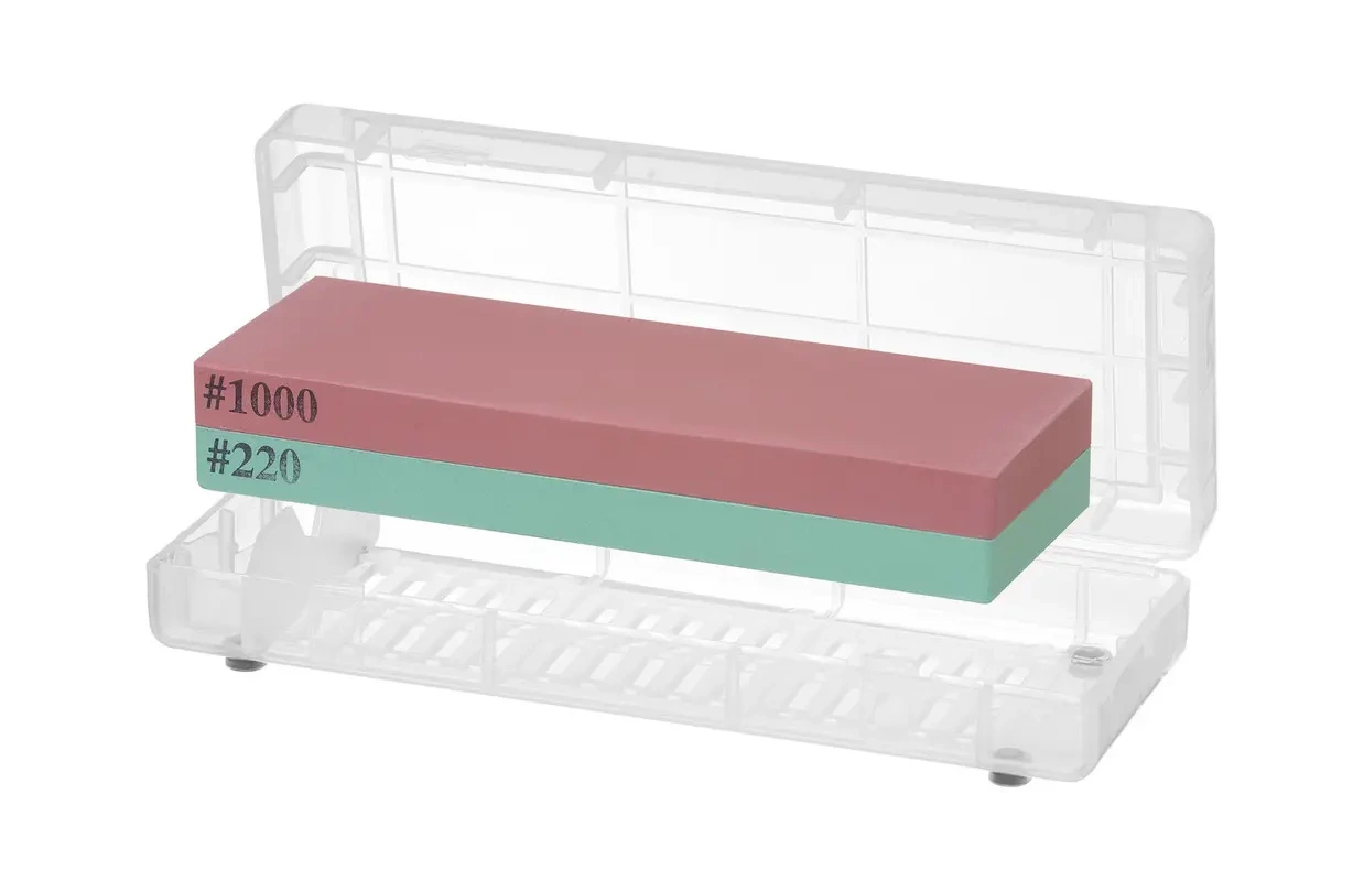 • Oboustranný kámen - kombinuje dvě desky různé zrnitosti, 220: pro regeneraci ostří a broušení čepele, 1000: pro základní broušení nožů.