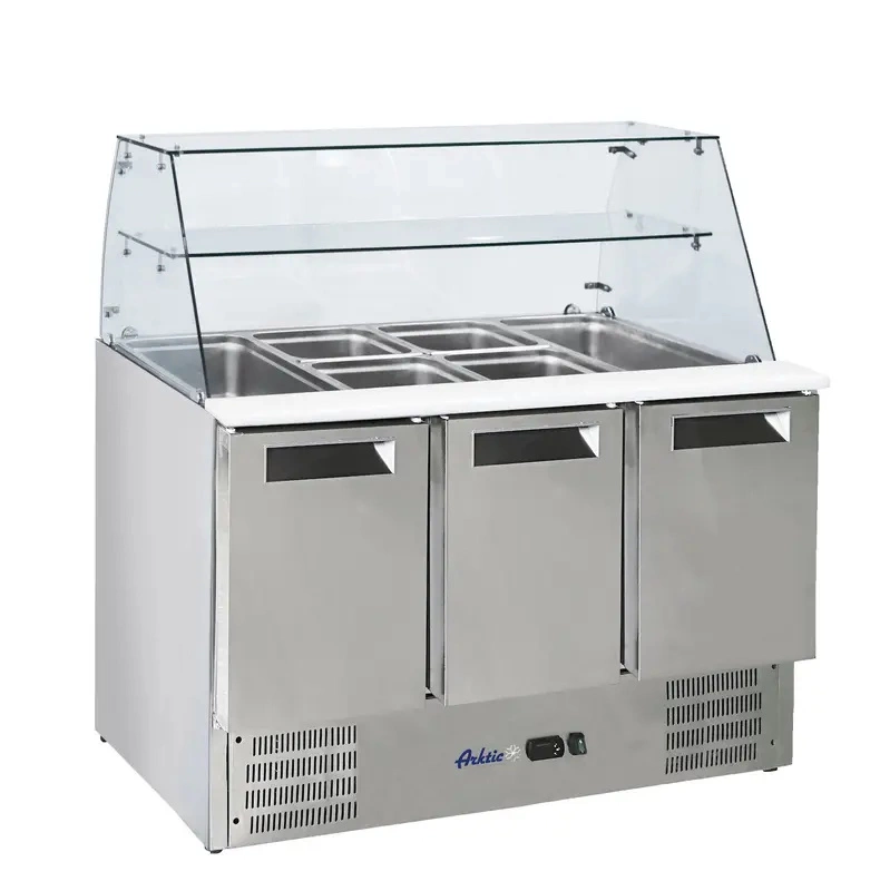 Chladicí salátový stůl se skleněnou deskou od společnosti Arktic je funkční a spolehlivý spotřebič, který v sobě spojuje estetiku, odolnost a chladicí výkon. Je ideální pro restaurace, salátové bary a další stravovací zařízení.
