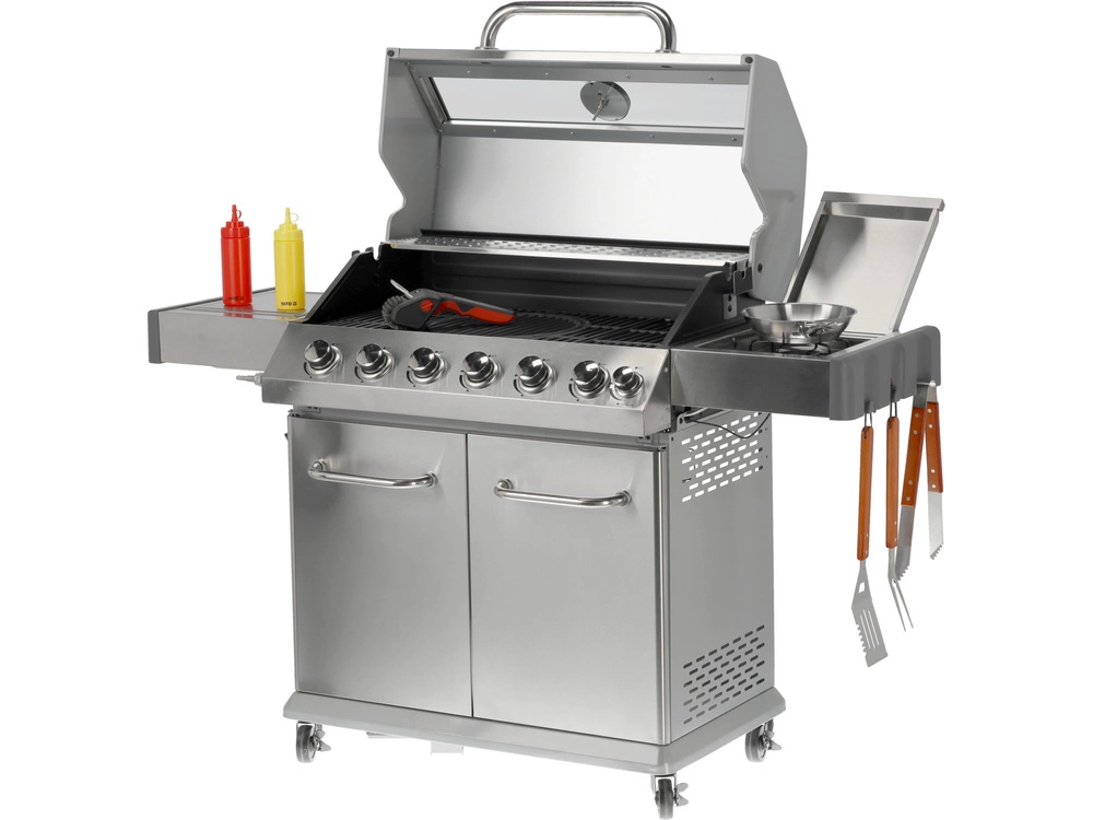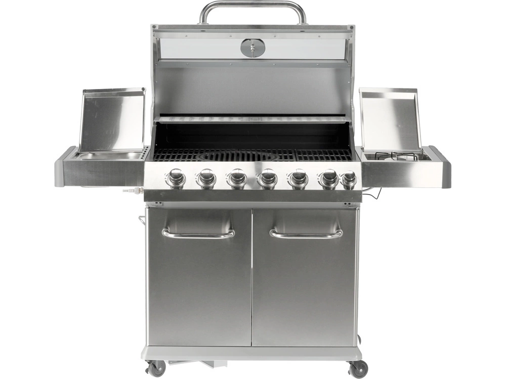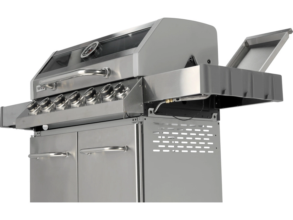 Moderní plynový gril YATO Itami se 7 hořáky (6 hlavních + 1 boční) s impozantním výkonem 20,2 kW je ideálním zařízením pro milovníky grilování na nejvyšší úrovni. Vybavený pevným litinovým roštem a pohodlným pracovním prostorem zajišťuje komfort a přesnost při přípravě pokrmů i pro velký počet hostů.