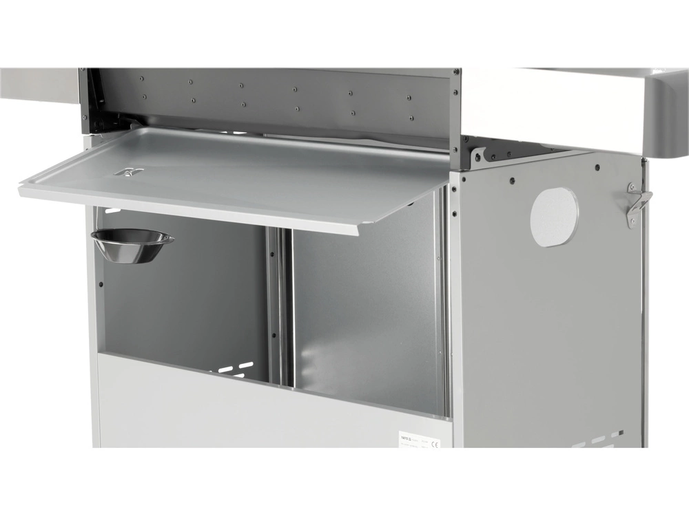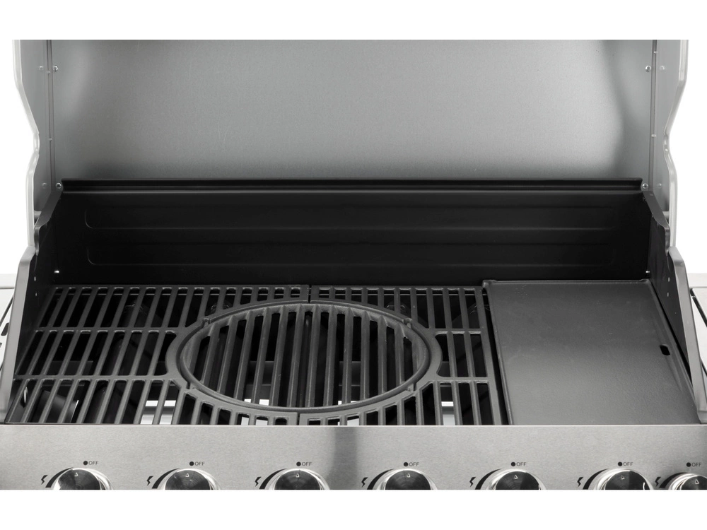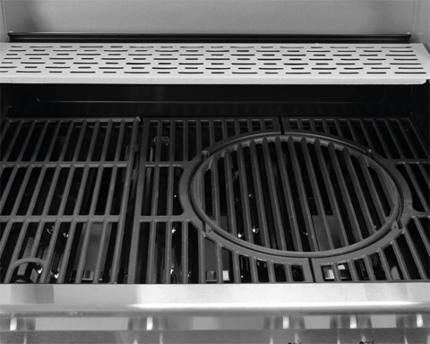 Litinový rošt s velkou plochou (82 x 41,5 cm) s vyměnitelným, kulatým roštem umožňujícím použití kamenné desky na pizzu.