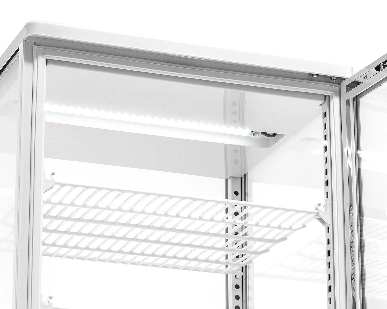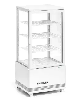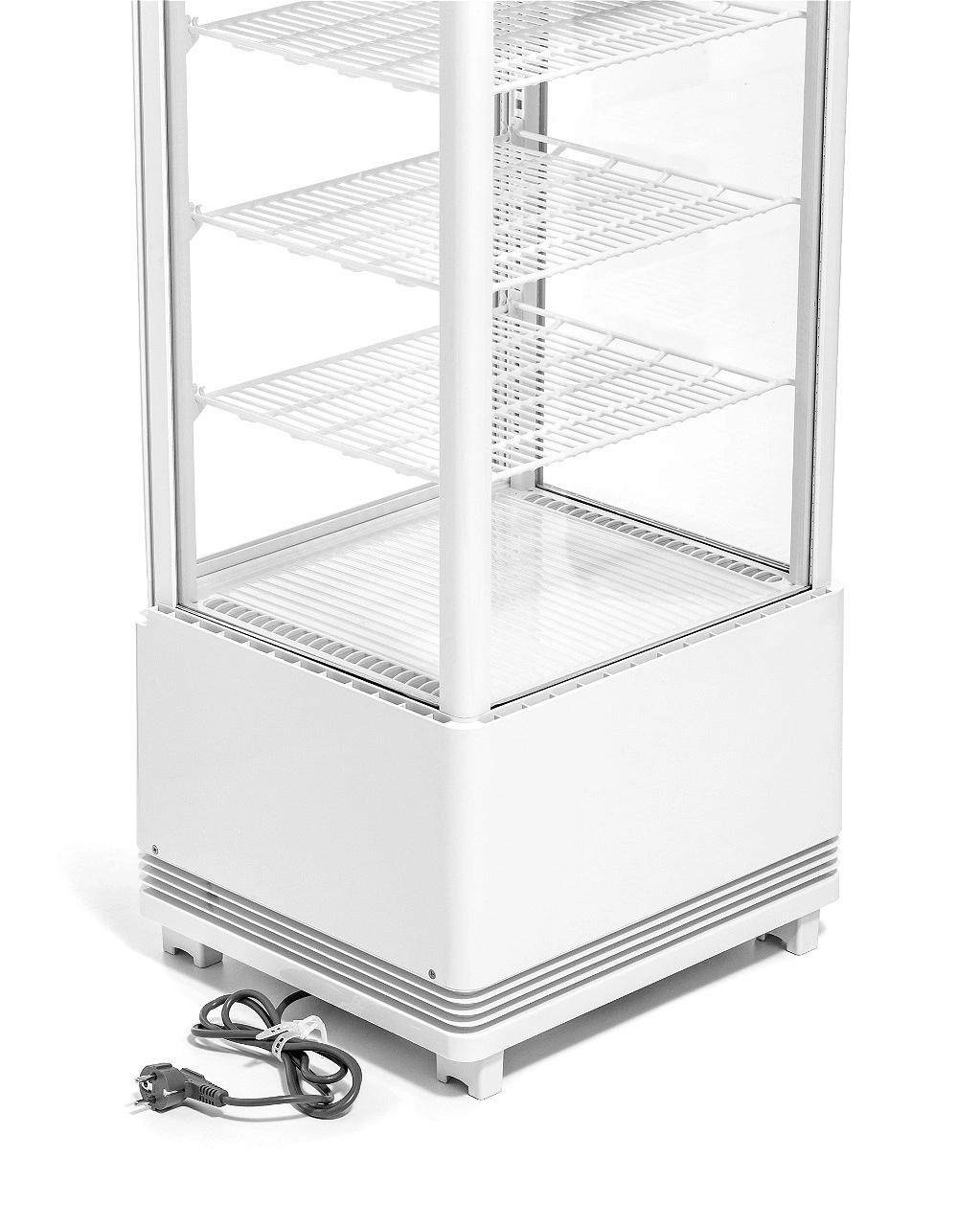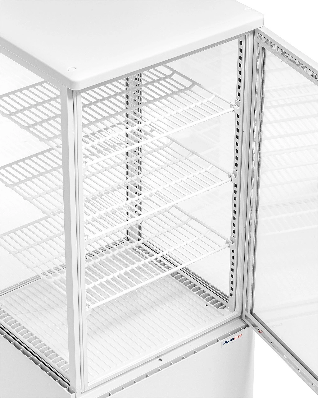 Zařízení je vyrobeno z odolné oceli lakované na bílo, což mu dodává moderní a elegantní vzhled. Prosklené stěny ze čtyř stran umožňují zákazníkům detailně si prohlédnout obsah bez nutnosti otevírání dveří, což je zvlášť důležité v maloobchodních prodejnách. Tři povrchově upravené police s nastavitelnou výškou umožňují flexibilní rozmístění sortimentu bez ohledu na jeho velikost. Vitrína je vhodná jak pro prezentaci cukrářských výrobků, tak i nápojů nebo hotových svačin v kavárnách, barech či potravinářských obchodech.