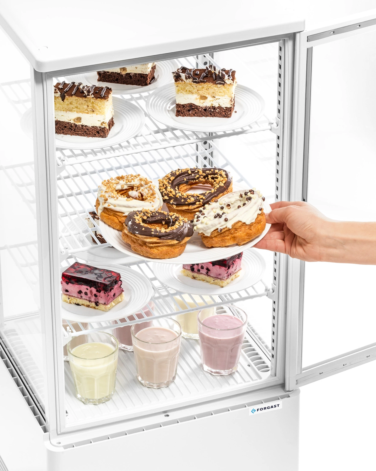 Chladicí vitrína 78 l bílá FORGAST FG07747 je profesionální zařízení určené k prezentaci a uchovávání potravin vyžadujících chlazení. Kompaktní konstrukce a moderní bílý design zajišťují, že vitrína skvěle zapadne do kaváren, cukráren i obchodů. Prosklený plášť ze všech stran umožňuje plnou viditelnost vystaveného zboží a nastavitelné police poskytují pohodlné rozmístění různých produktů.