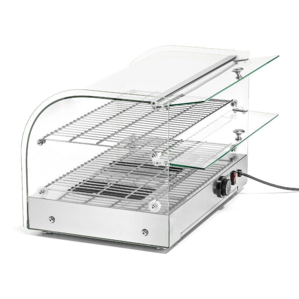 Konstrukce dvouúrovňové vyhřívané vitríny je založena na robustním rámu z nerezové oceli, který zaručuje dlouhou životnost a odolnost proti intenzivnímu používání. Dvě úrovně expozice umožňují současnou prezentaci různých pokrmů, například teplých housek na horní polici a pečiva na spodní. Zařízení se osvědčí jak v cukrárnách k prezentaci čerstvých dortů, tak v rychlých občerstveních, kde je důležitý rychlý přístup k teplým snackům. Součástí balení je vitrína s kompletem polic a nádobou na vodu, která pomáhá udržet optimální úroveň vlhkosti.