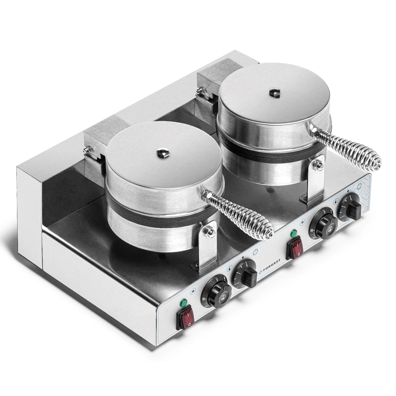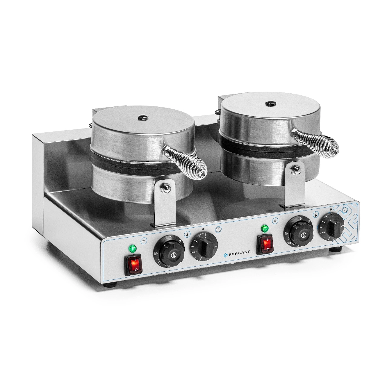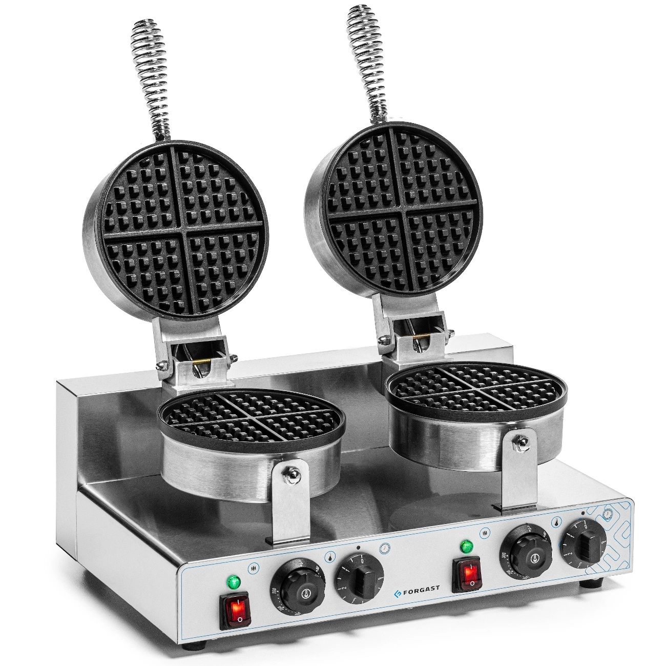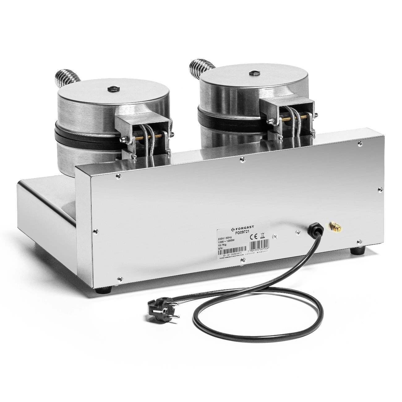 Profesionální elektrický vaflovač Forgast FG09721 je odolné zařízení určené pro intenzivní použití v gastronomii. Umožňuje současnou přípravu dvou velkých, kulatých belgických vaflí. Vyznačuje se vysokým výkonem a širokým rozsahem regulace teploty, což umožňuje přesné přizpůsobení parametrů pečení různým recepturám a požadavkům zákazníků. Ideální pro kavárny, food trucky, hotelové bufety i sezónní stánky.
