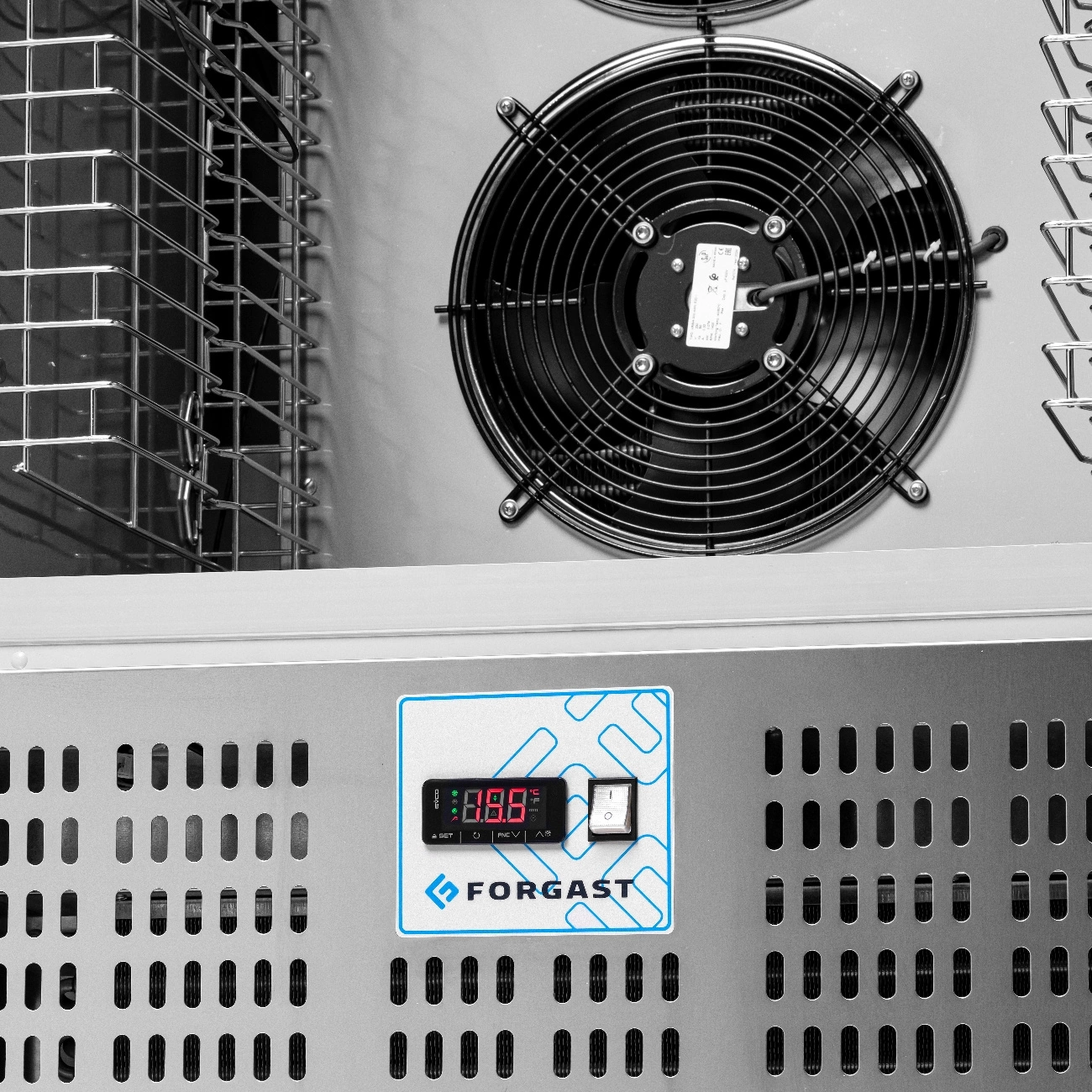 FORGAST FG07610V1 byl navržen s ohledem na pohodlí uživatele a maximální funkčnost. Komora zařízení pojme až 10 nádob GN 1/1, což umožňuje současnou přípravu mnoha dávek produktů – jak hotových jídel, tak polotovarů vyžadujících rychlé zchlazení nebo zmrazení. Dveře z nerezové oceli jsou vybaveny pohodlným, dlouhým madlem a automatické dovírání pod úhlem 90° dále zvyšuje komfort používání a omezuje zbytečné ztráty energie.